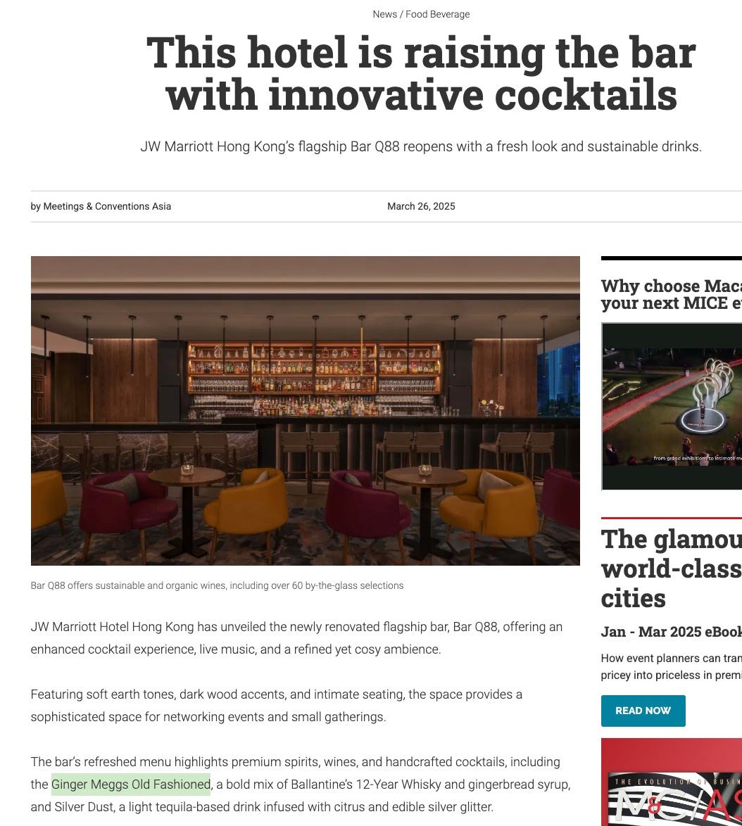 There it was on the glossy menu - a "Ginger Meggs Old Fashioned" at Bar Q88 in Hong Kong's JW Marriott. The cocktail features Ballantine’s 12 years, gingerbread syrup, chocolate bitters, and Angostura bitters.