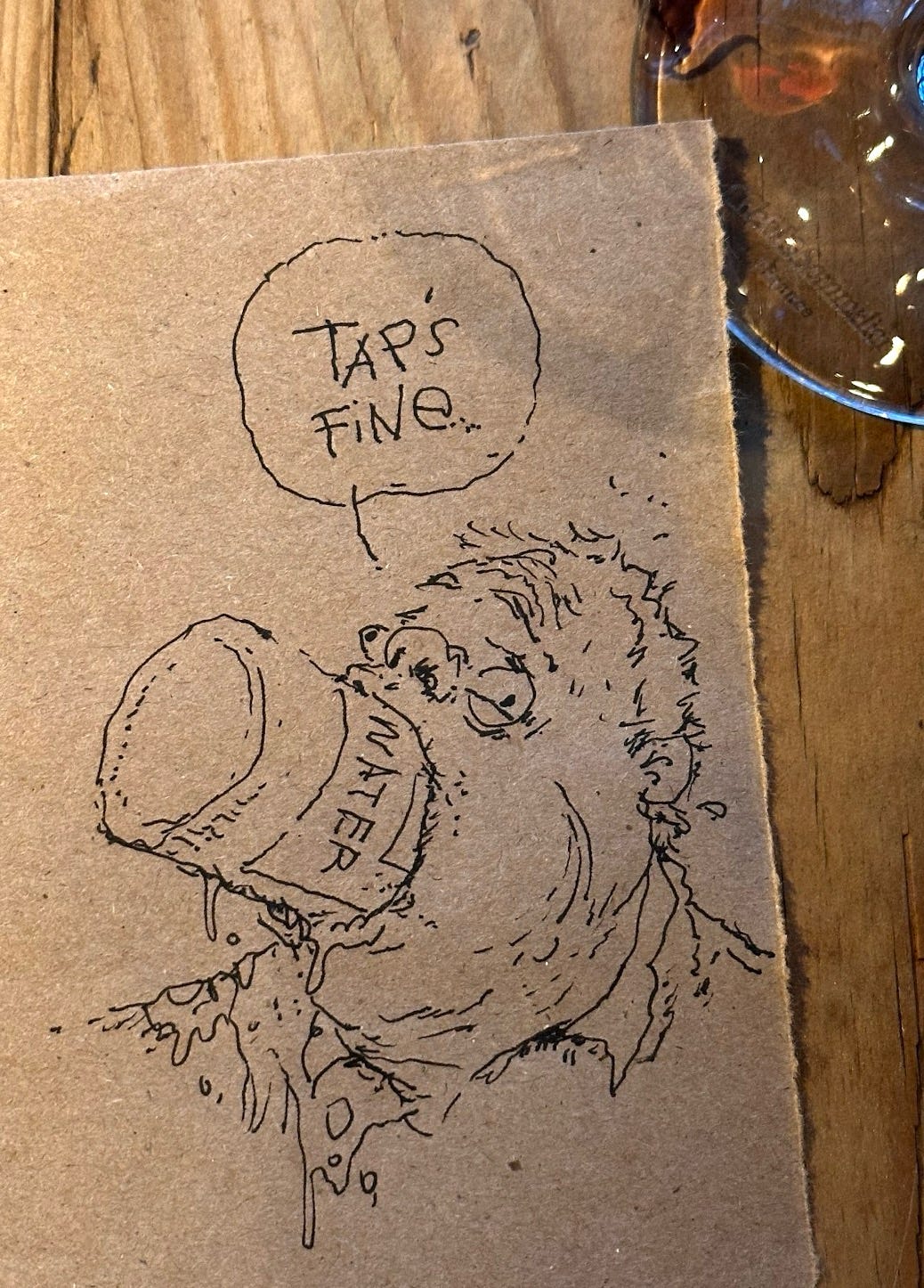 Here’s a sketch from a tablecloth at dinner this week. (I shouldn’t be let into nice places with pens.)