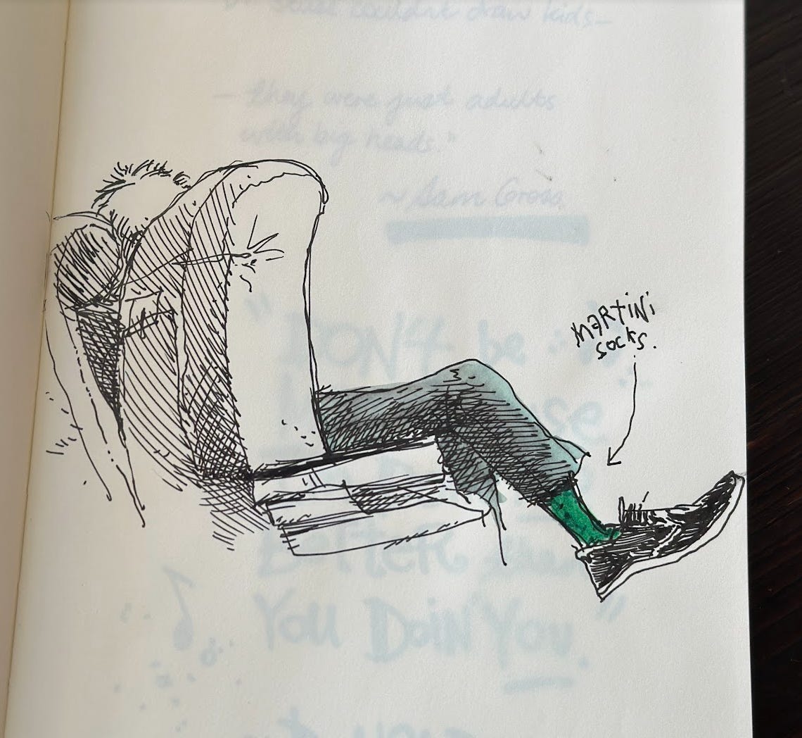 Here’s a sketch from an Amtrak ride in 2023. I spotted a guy wearing cool socks…