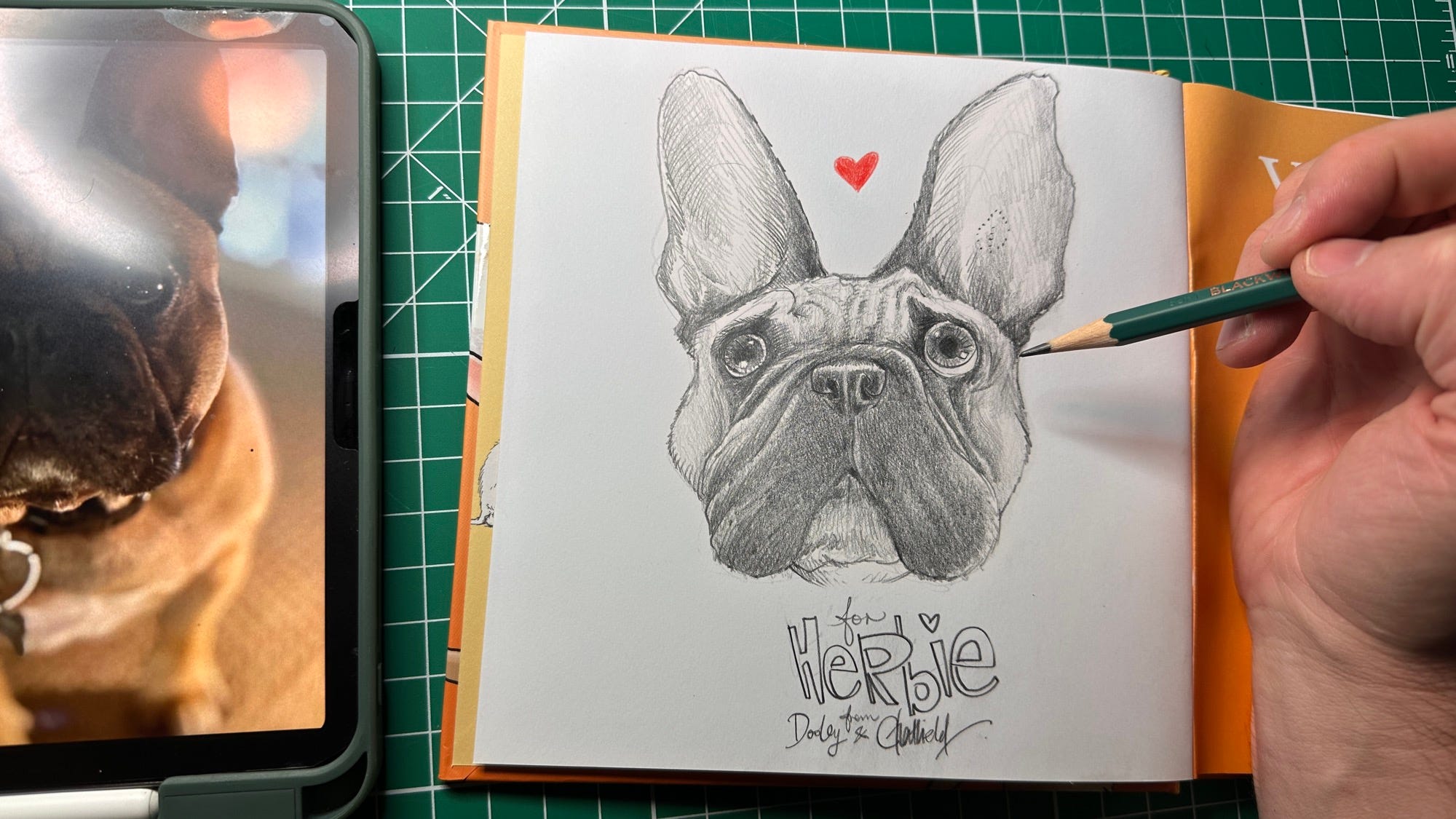 The Sketchbook I’m sharing with you this week is a selection of the sketches I did of people’s dogs as gifts this past week. If you have a friend with a dog, send me a photo and I’ll draw them into the book for you.