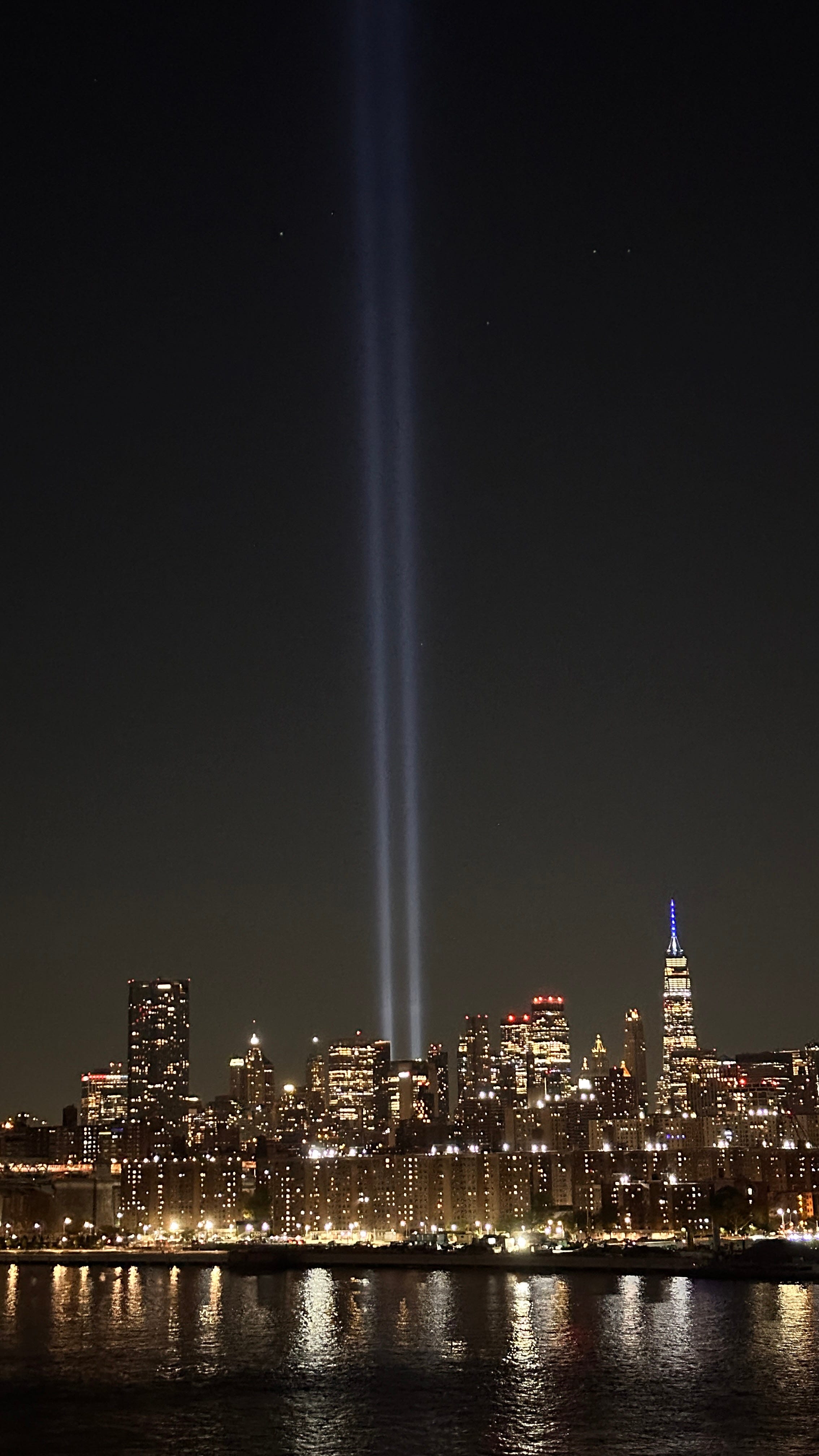 Every year they blast the giant lights into the sky where the towers once stood. You can see them from pretty much anywhere you stand— which makes it all the more surreal thinking about the enormity of what happened on that day on these streets. Here’s a photo I took of the view from Brooklyn:
