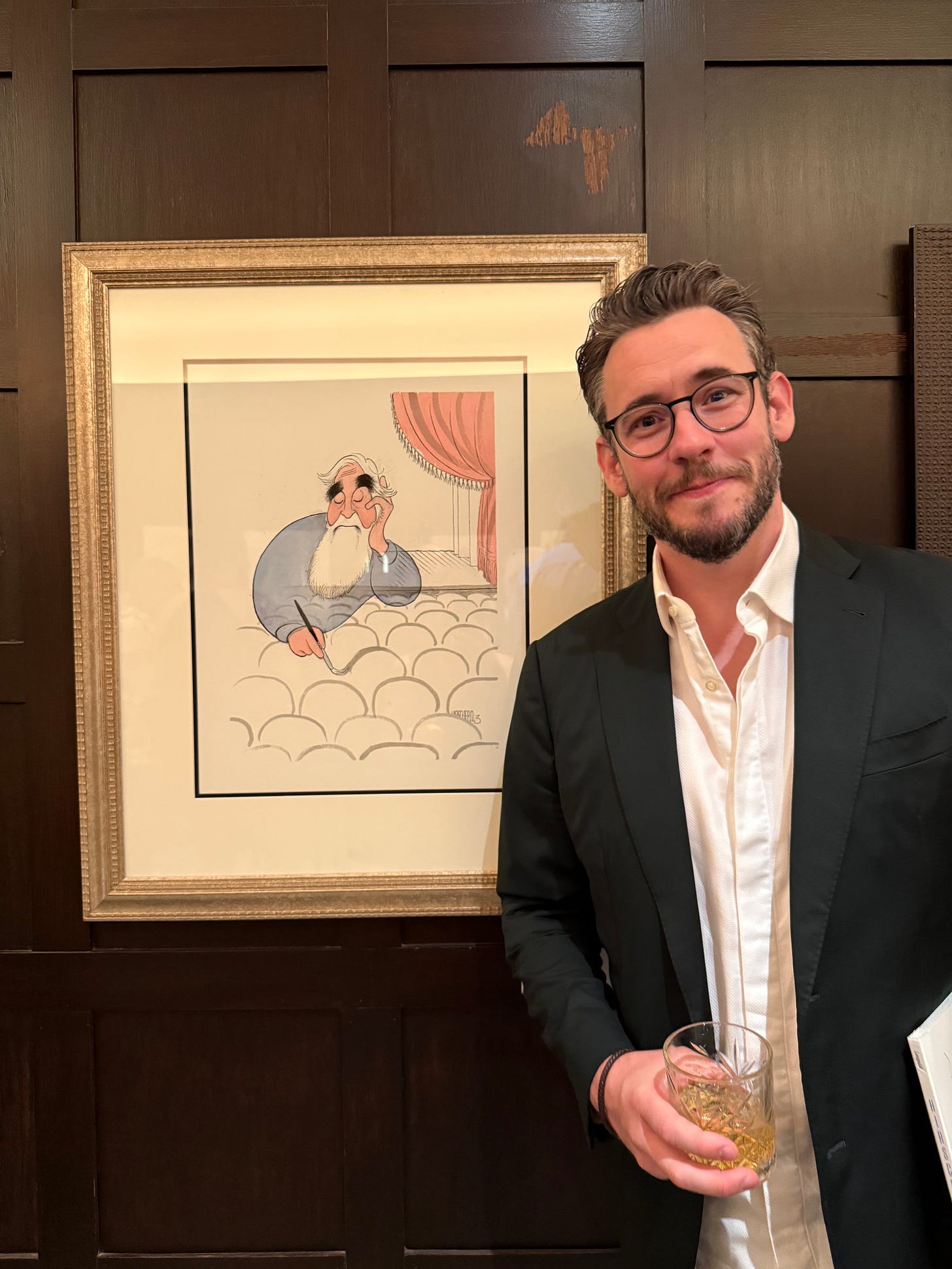 I grew up poring over Hirschfeld’s work, tracing his lines with my eyes, learning how much you can do by leaving most of it out. To stand in the Algonquin, where he once drew his peers, and be surrounded by his work alongside people I know—it reminds me this is exactly why I moved here. To be around it, learn from it, absorb it, and (hopefully) get better.