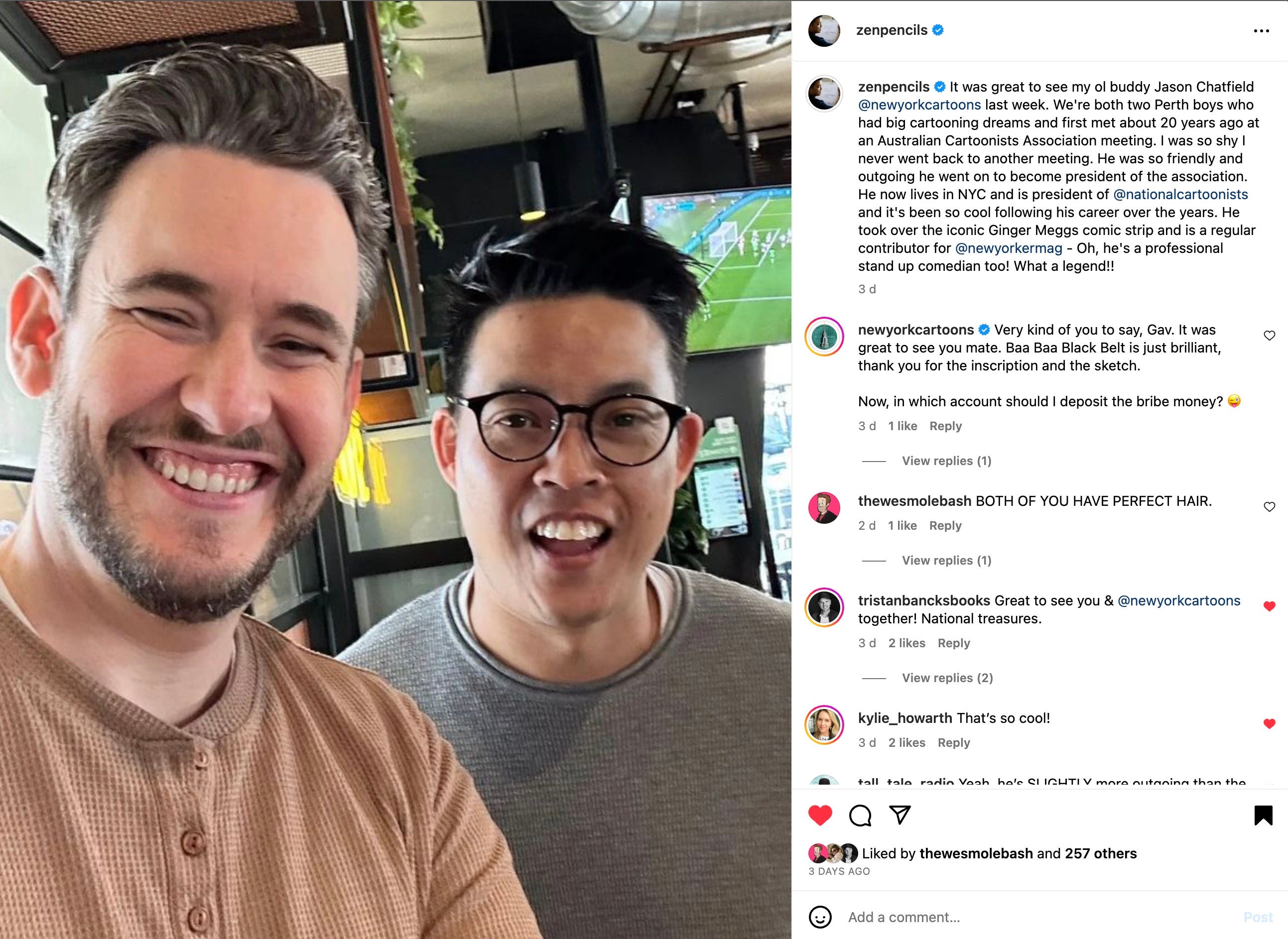 On Friday, I sat down with - creator of Zen Pencils, author of the brand-new Creature Clinic, and someone whose laughter I recognised from two decades ago in Perth when we were both sketching during our day jobs, wondering if cartooning was a viable life choice.