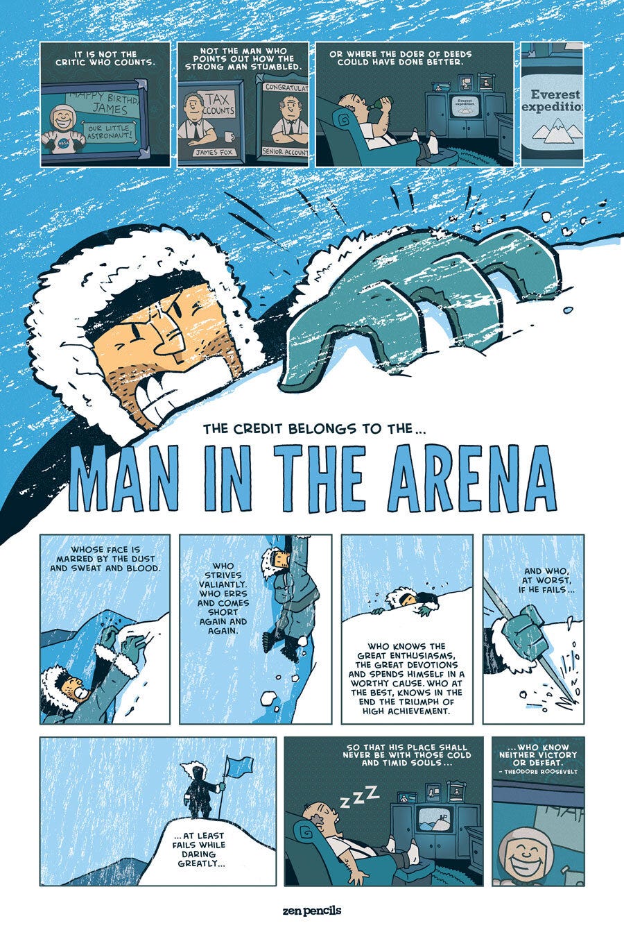 So he quit his job as a newspaper graphic designer. “I hated it. Everyone around me was getting made redundant. I thought, I need to do something drastic.” Around 2011, he launched Zen Pencils — turning famous quotes and speeches into comics. It went viral.