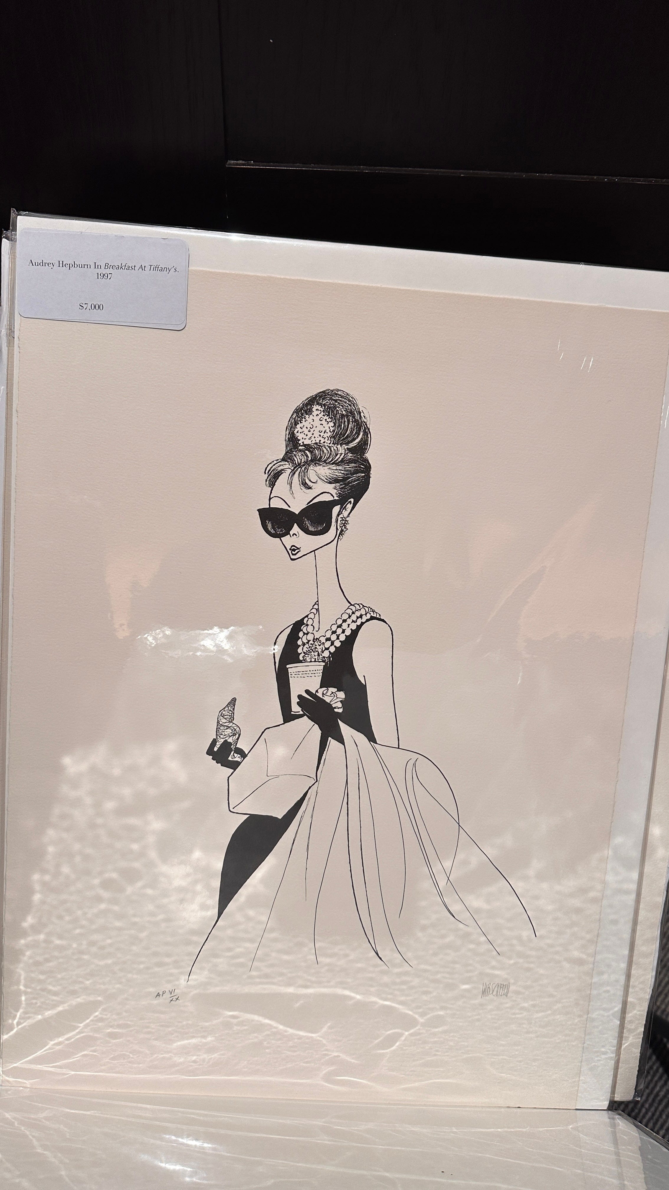 The exhibition features more than two dozen works from stage, screen, and concert hall. Everything is for sale, with proceeds supporting the Foundation: There’s Gershwin, a Carol Burnett TV Guide cover painting, and portraits of Algonquin Round Table members Alexander Woollcott and Robert Benchley. The centrepiece is a Sondheim spread worthy of its own overture: the original drawing for Do I Hear a Waltz?, lithographs for Forum (Nathan Lane), Passion, Putting It Together, and a 1977 Sondheim portrait signed by Hirschfeld. There’s an etching of Gypsy with Ethel Merman, plus performer-signed giclées of Sunday in the Park with George (edition of 15), Julie Andrews in Putting It Together (edition of 15), and a Sondheim 1999 portrait signed by Sondheim himself—one of only four in existence.