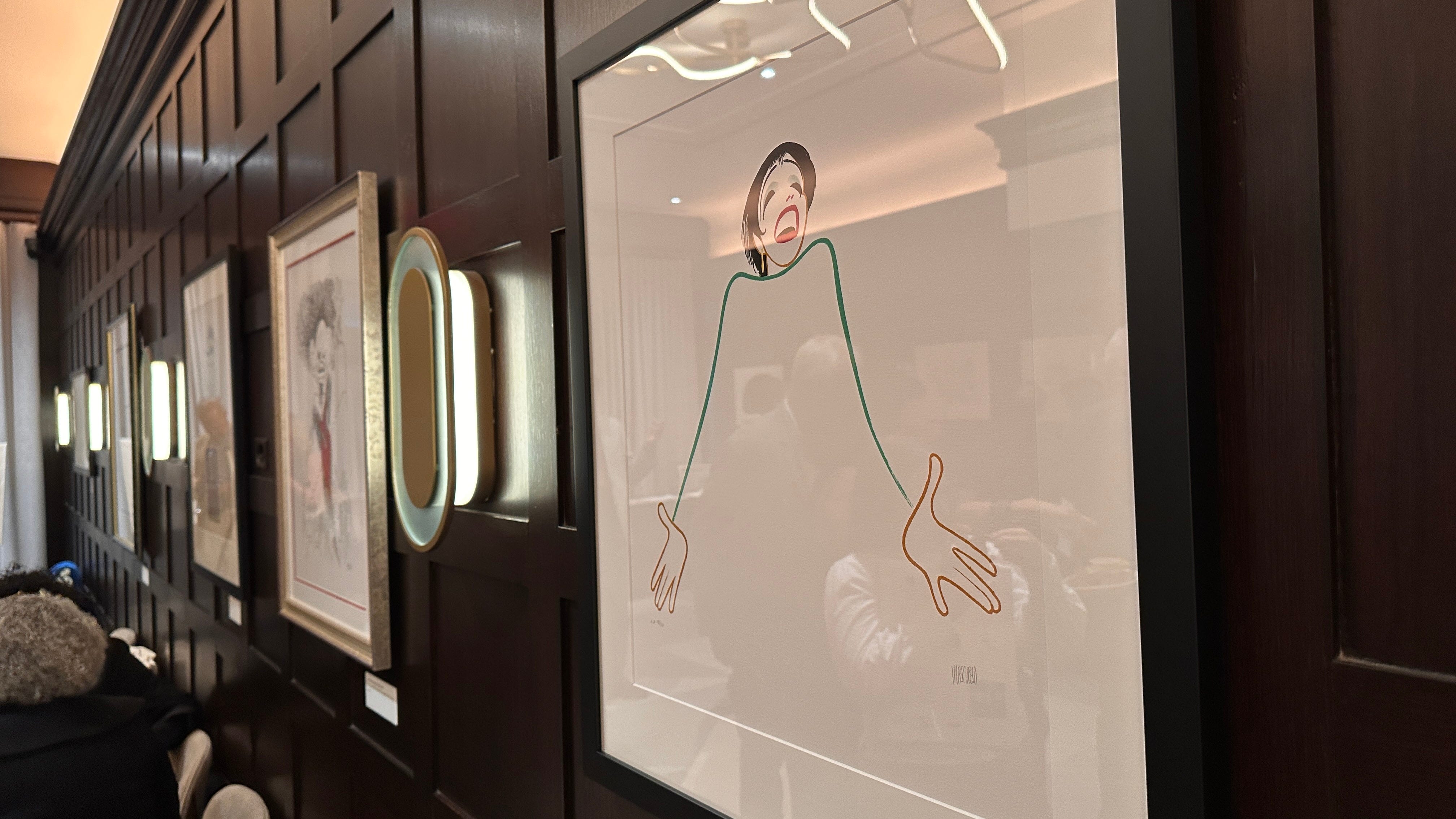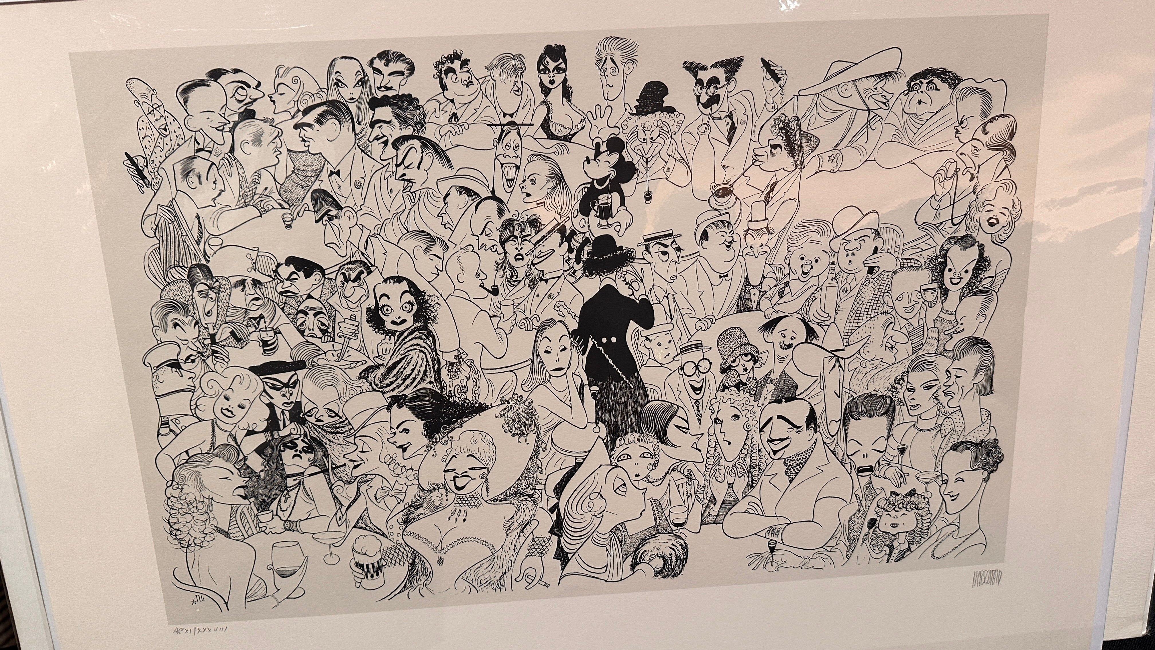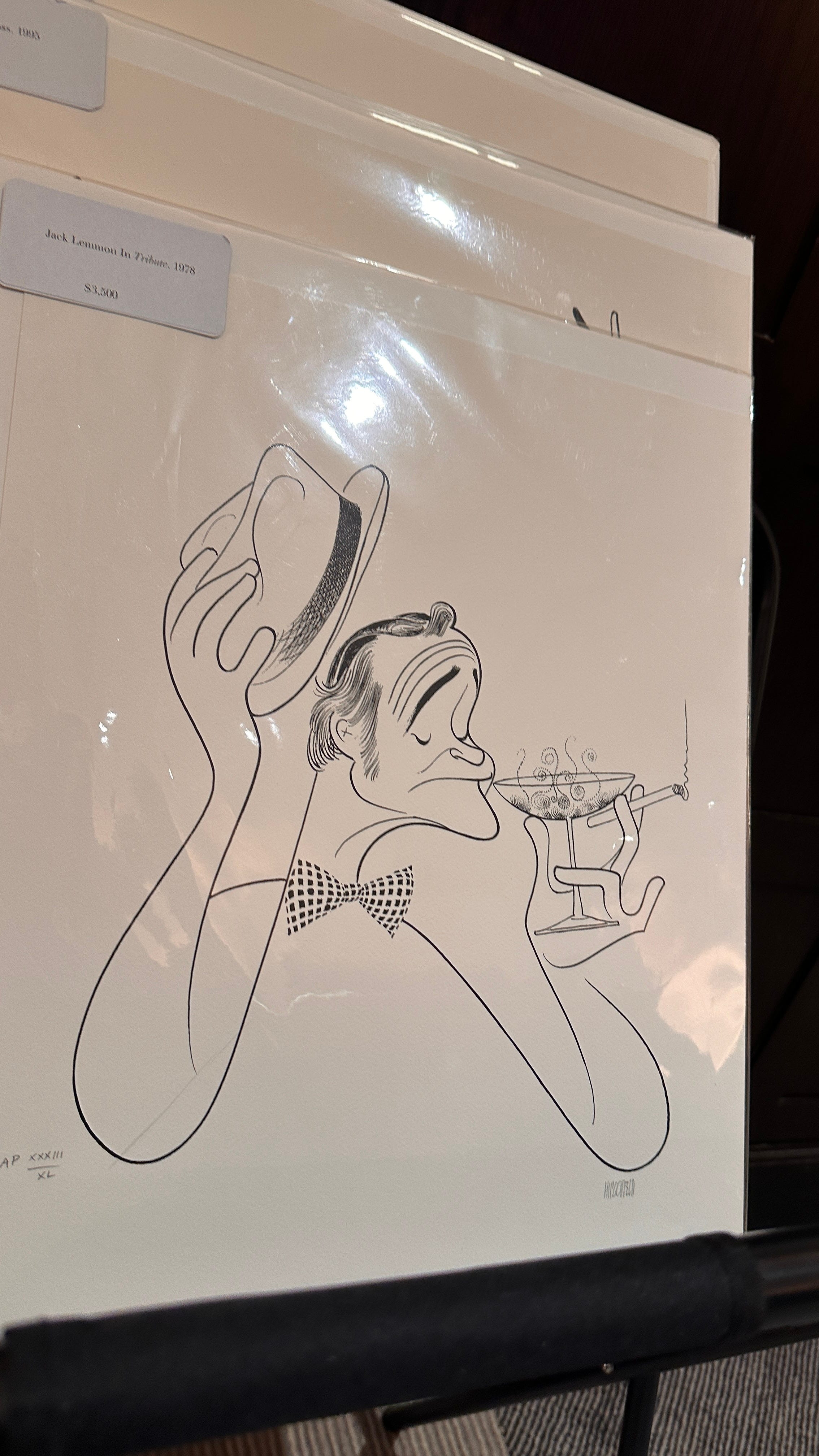 I grew up poring over Hirschfeld’s work, tracing his lines with my eyes, learning how much you can do by leaving most of it out. To stand in the Algonquin, where he once drew his peers, and be surrounded by his work alongside people I know—it reminds me this is exactly why I moved here. To be around it, learn from it, absorb it, and (hopefully) get better.