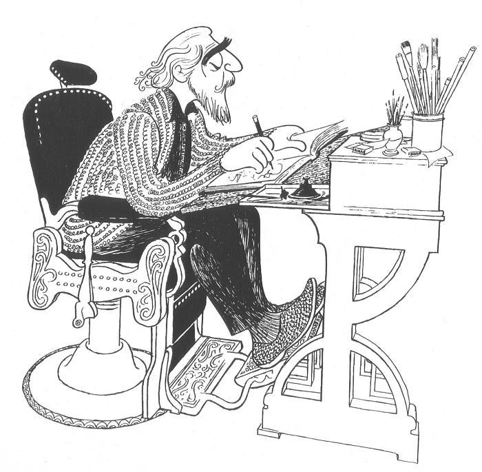 If you were immortalised by Hirschfeld, you were minted. It meant you’d made it. Every Sunday, readers of the New York Times would flip to the Arts & Leisure section for his drawing, then count the hidden NINAs—the name of his daughter, tucked into hair and sleeves. The number beside his signature told you how many to find. Parents passed the page to their kids like a puzzle. An entire generation grew up on that ritual.