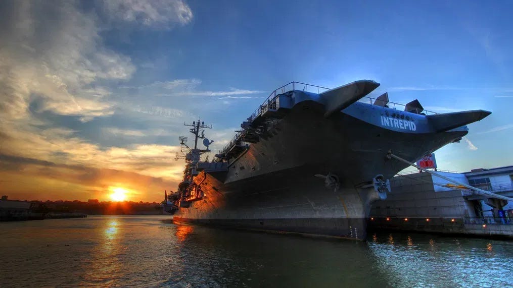 When the ceremony ends with the haunting notes of the Last Post—the bugler positioned just so, with the massive silhouette of the Intrepid looming above—I think of my grandfather (“Poppy”). I was very lucky I got to spend so much time with him growing up. When I still lived in my hometown, my sister or I used to march in the parade alongside him and the remaining survivors of his battalion. My whole family would turn out to cheer them on from the sidelines.