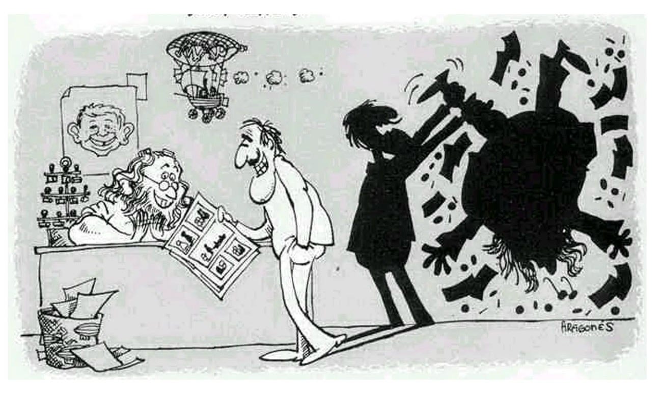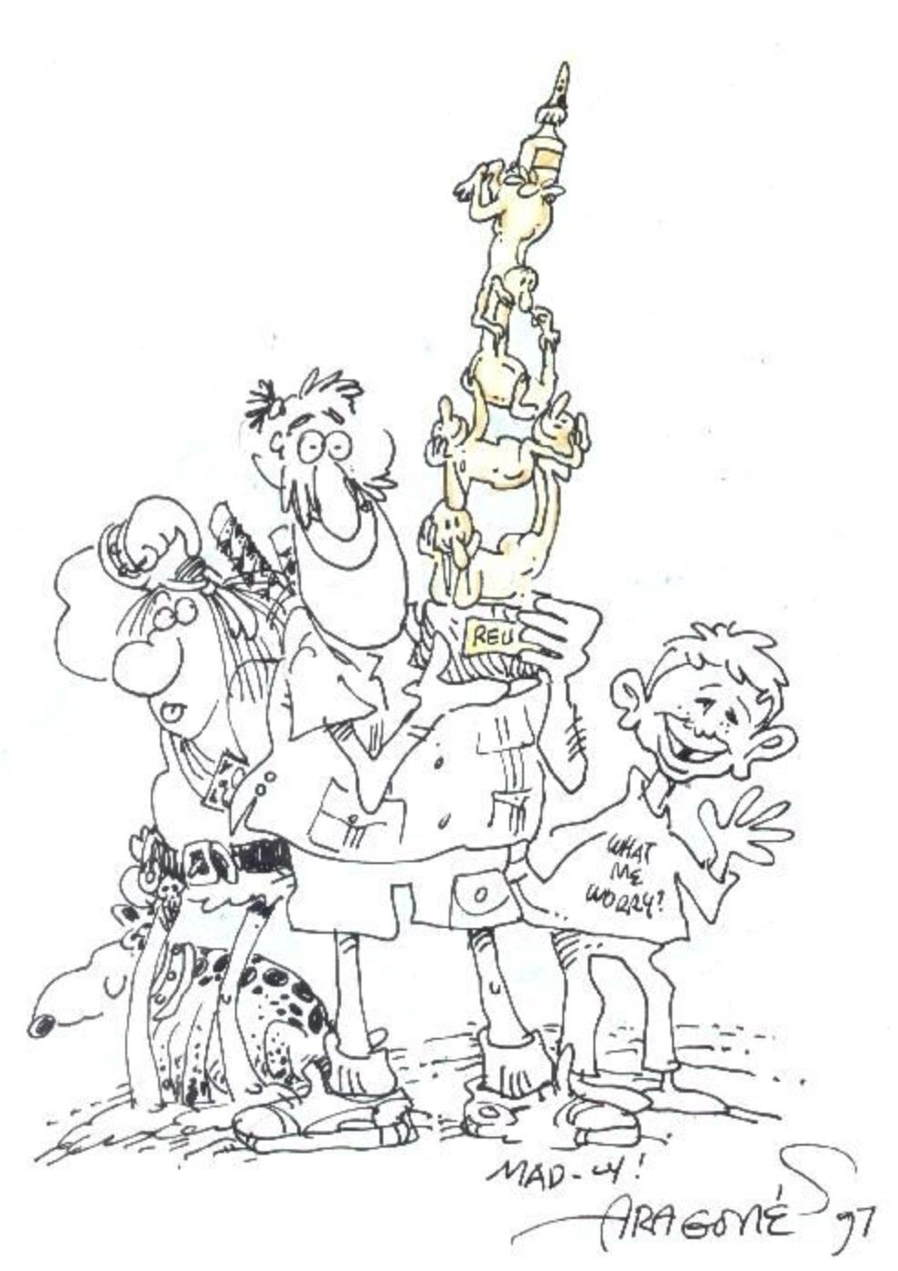 won’t mind me sharing a recollection he wrote about the “Drawn Out Dramas” marginal cartoons origin story:Sergio once told me the origin of his “Drawn Out Dramas”. When he first started working for MAD editor Al Feldstein and publisher Bill Gaines loved his work but they didn’t know how many jobs they could give him.