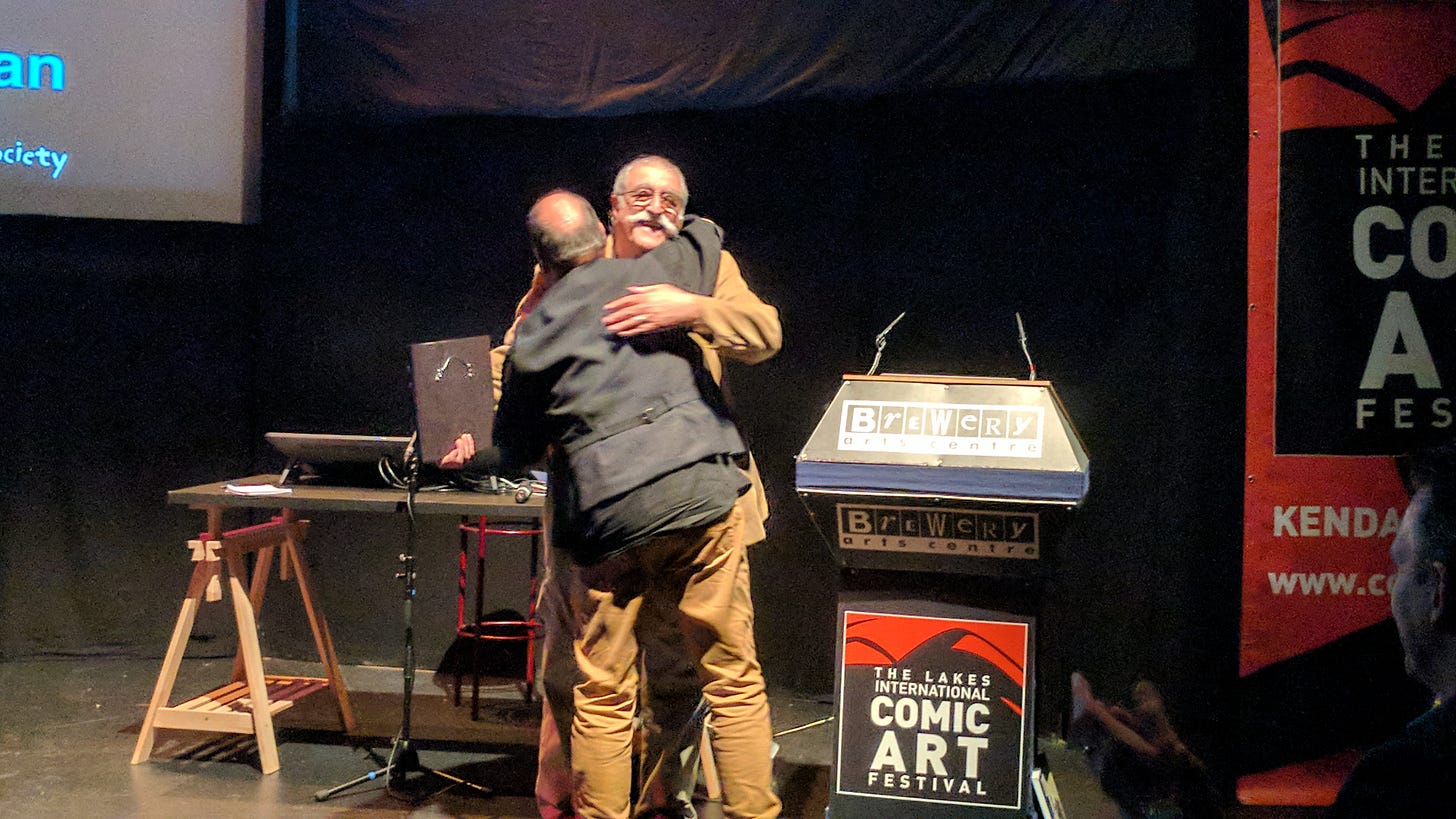 Watching this legendary cartoonist—who had influenced generations of artists—honour another master of visual storytelling was genuinely moving. The award has since become one of the most prestigious recognitions in international comics, with subsequent winners including Hunt Emerson, Charlie Adlard, Boulet, Posy Simmonds, and VIZ comics. But there was something magical about that inaugural moment in Kendal, seeing Sergio’s genuine joy in celebrating another artist’s work before Dave jumped up and gave Sergio a big hug.