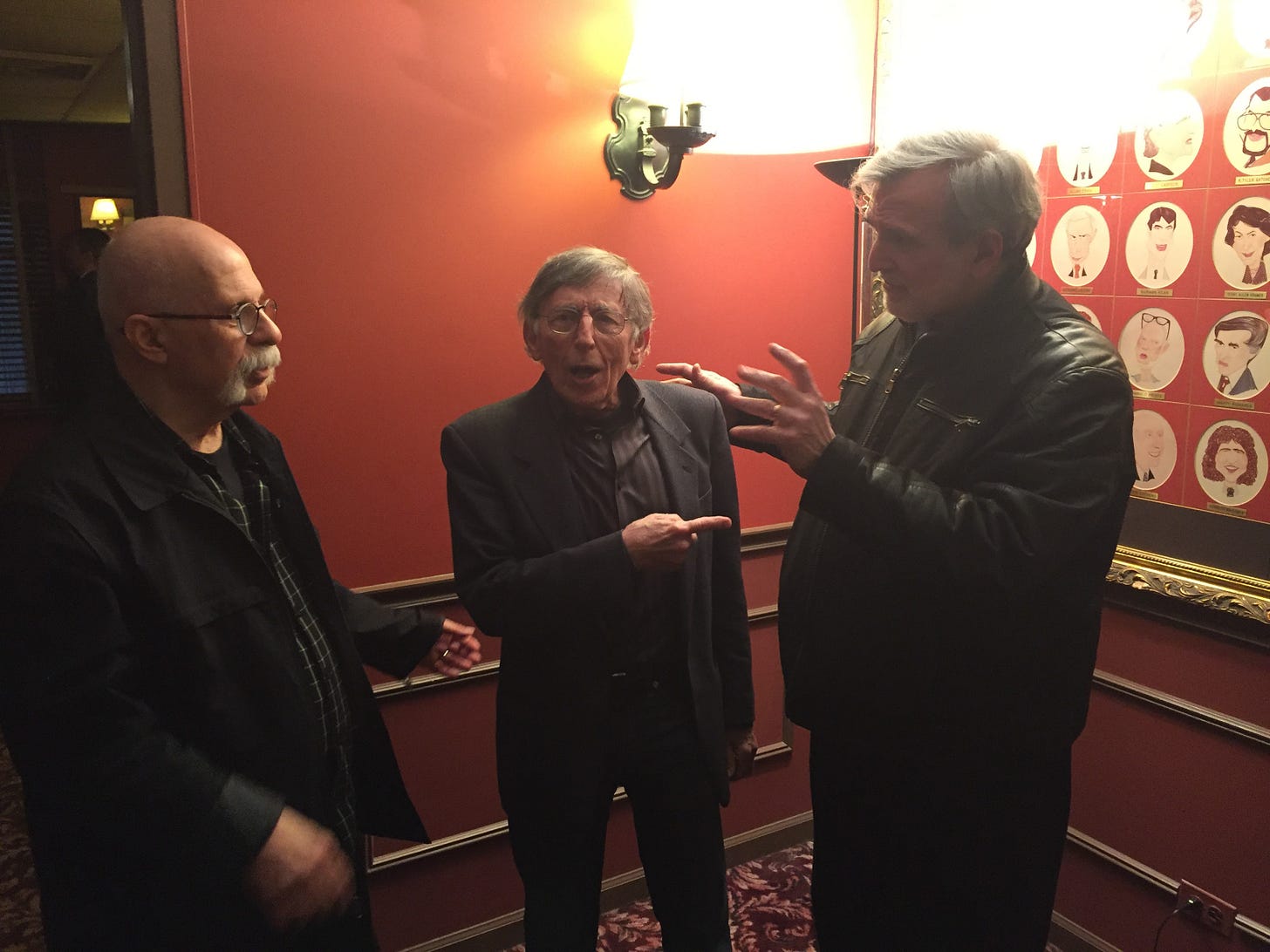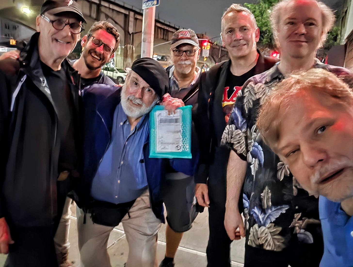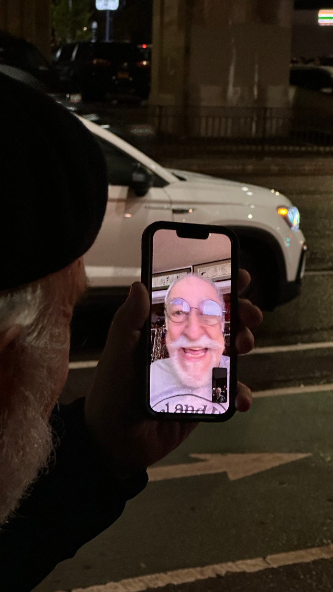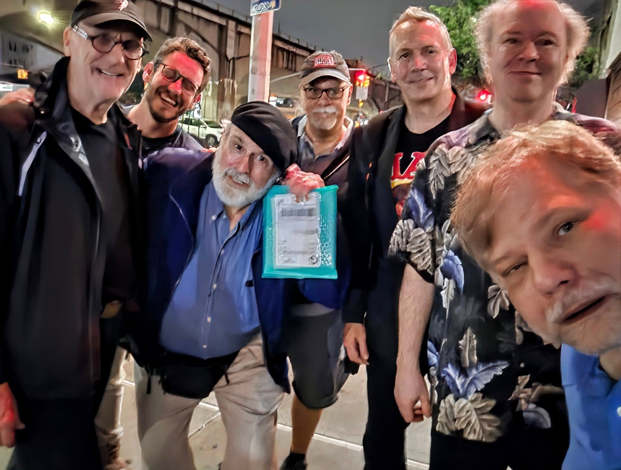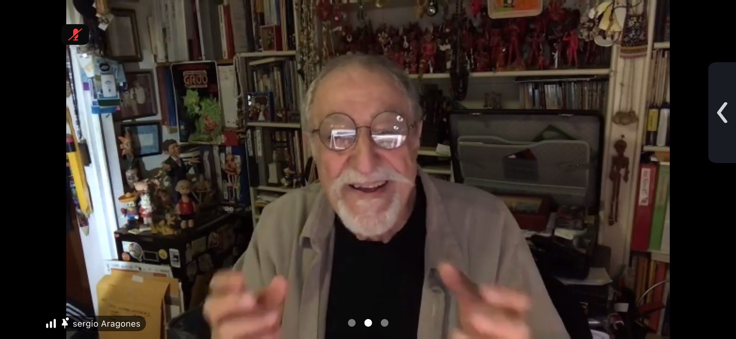 Earlier this month, the “usual gang” in New York got together to see Tom Richmond. It was Sergio’s birthday, so long-time MAD Art Director, Sam Viviano, pulled out his phone and Facetimed Sergio, who was back at his drawing board in Ojai. We all got to wish him a happy birthday (Feliz Cumpleaños!).
