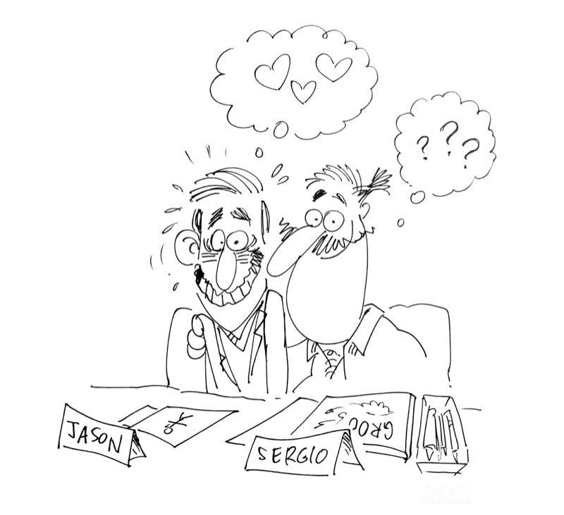 Picture this: a young Mexican cartoonist with an extravagant moustache, speaking English as his third language, wandering the streets of New York with dreams 100x bigger than his bank account. He found himself at a party in the West Village where he didn’t know anybody, much less understand them. He didn’t speak English. That’s where he bumped into the legendary New Yorker cartoonist Mort Gerberg, who spoke enough Spanish to strike up a friendship with Sergio and give him a few pointers as to how to get a foot in the door in the cartooning world.