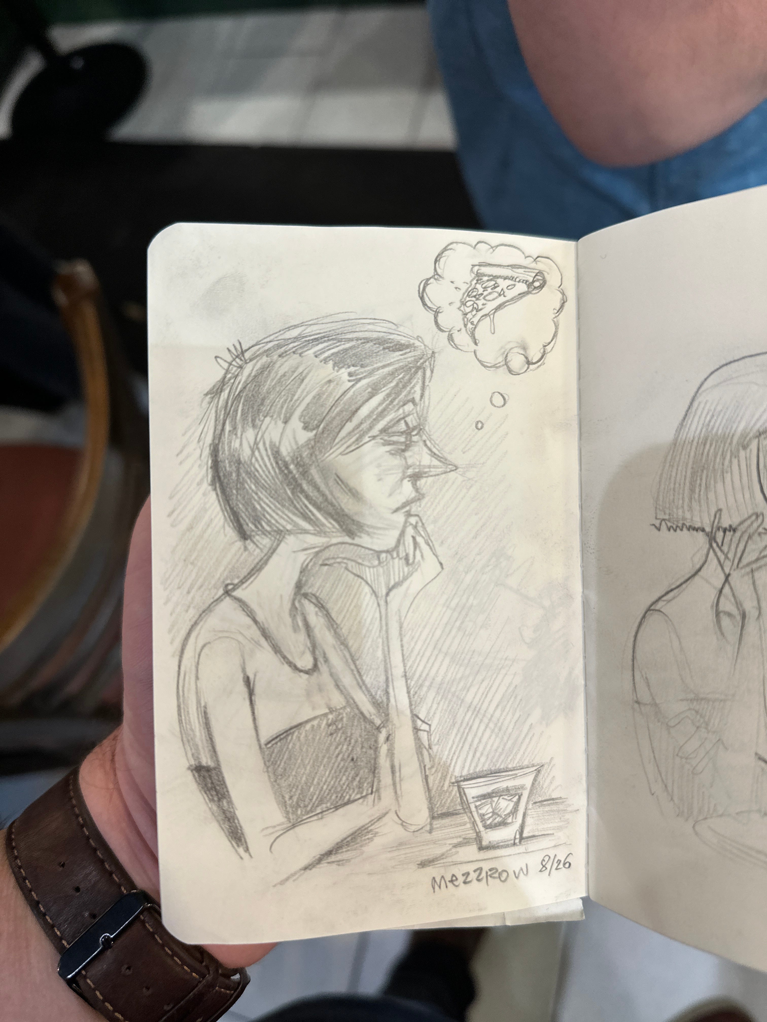 for Waking Up. I think he has a great face. (Also a great Substack.)I was pedalling a broken Citibike down University Place this morning when I spotted her outside Madman Espresso: A woman sat casually reading the Times, coffee in hand, with a bird perched on her shoulder. The magnificent accessory—a Congo African Grey Parrot—was having what appeared to be a quiet breakfast conversation with her, occasionally dipping its beak towards her cup when she took a sip. I heard it squawk “Epstein!” a couple of times. They had the ease of an old couple who have been doing this morning routine for decades. I sneakily made a quick sketch before toppling over on the bike. The bell came off. Don’t tell anyone. (Keep reading below…)