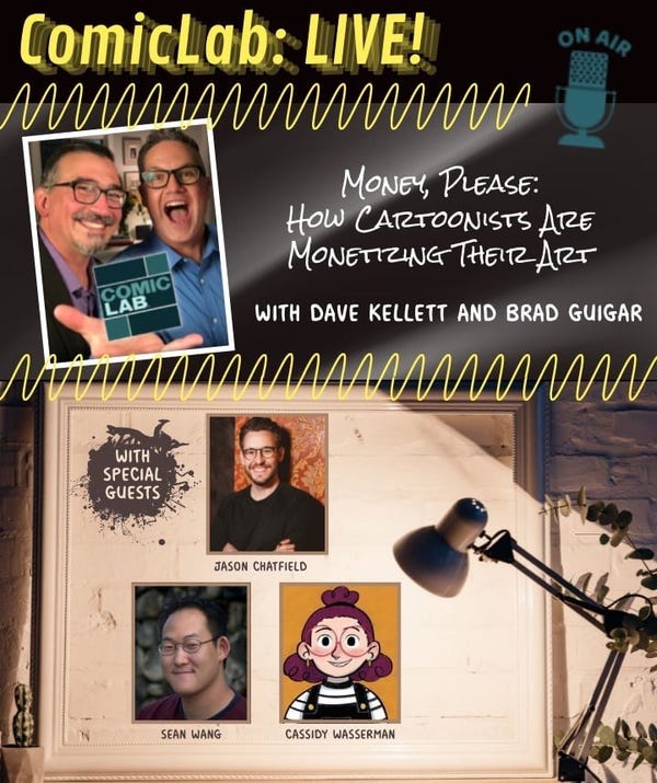 I’ll be on the ComicLab podcast LIVE in Boston in August, talking about Substack, and how cartoonists are trying to scrape together enough money for cup noodles in 2025. It’ll be a fun chat with two of my favourite cartoonist podcasters—Dave Kellett of