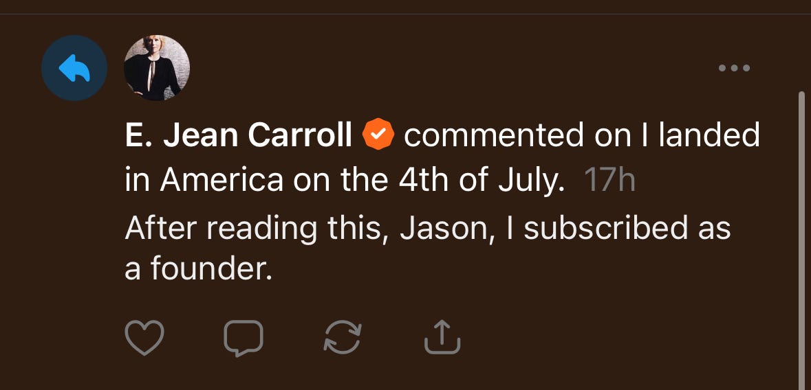 The amazing E. Jean Carroll (IYKYK) has been enjoying this here newsletter and was nice enough to let me know she is now a Founding Member. If you’d like to upgrade your subscription to Founding, and support my work here, I would love you to do so here.