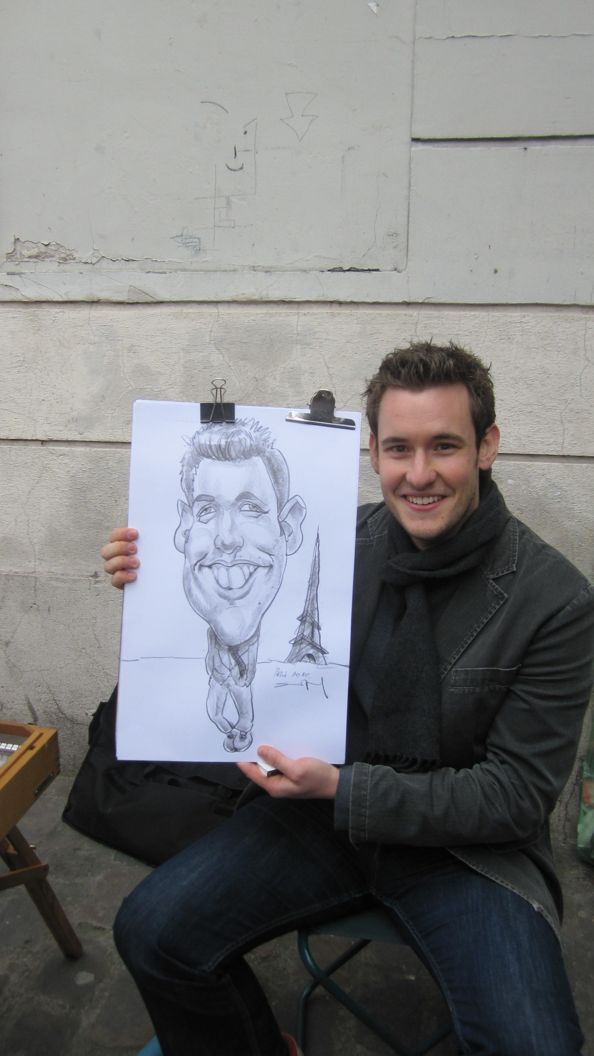 They started asking me questions in French, and I could only just make out what they were saying. My guy finished off the caricature of me, then showed it to me.