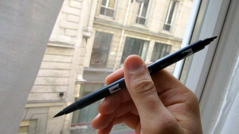 The Tombow marker is the one I use when I do live caricaturing gigs. It’s double-tipped, with one side as a brush tip, and the other side as a finer felt-tip for hatching. They run out quickly, they smudge, and they’re expensive, but they’re my weapon of choice. Everybody’s got something different.