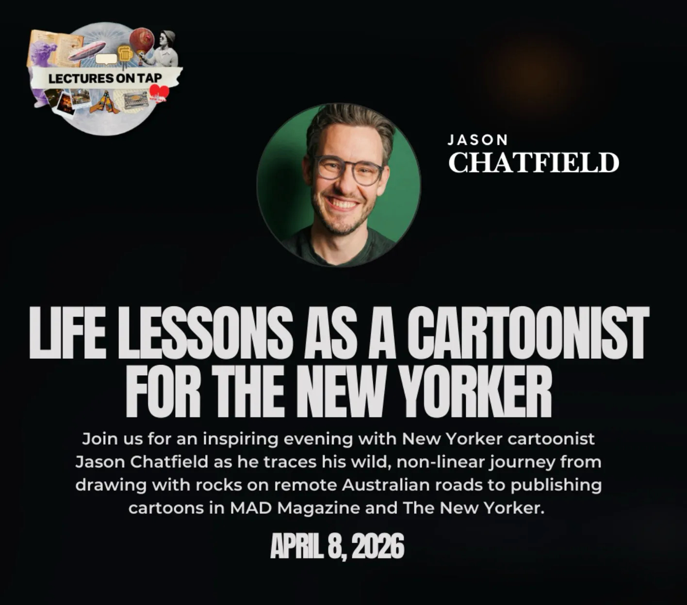 I am hosting a live Lectures on Tap event at a bar in the West Village. I will desperately try to explain how I went from drawing with literal rocks on remote Australian dirt roads to actively arguing with editors at The New Yorker over a sketch of an elephant buying peanuts.