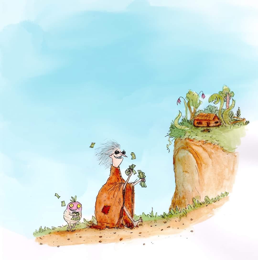 Kyle is a “mixed media” artist, which is a polite way of saying he is good at literally everything. He spent 15 years as a sculptor before pivoting to watercolour and ink, and the result is a style that looks as if Quentin Blake and Shel Silverstein had a baby, and then that baby was raised by goblins in a swamp.
