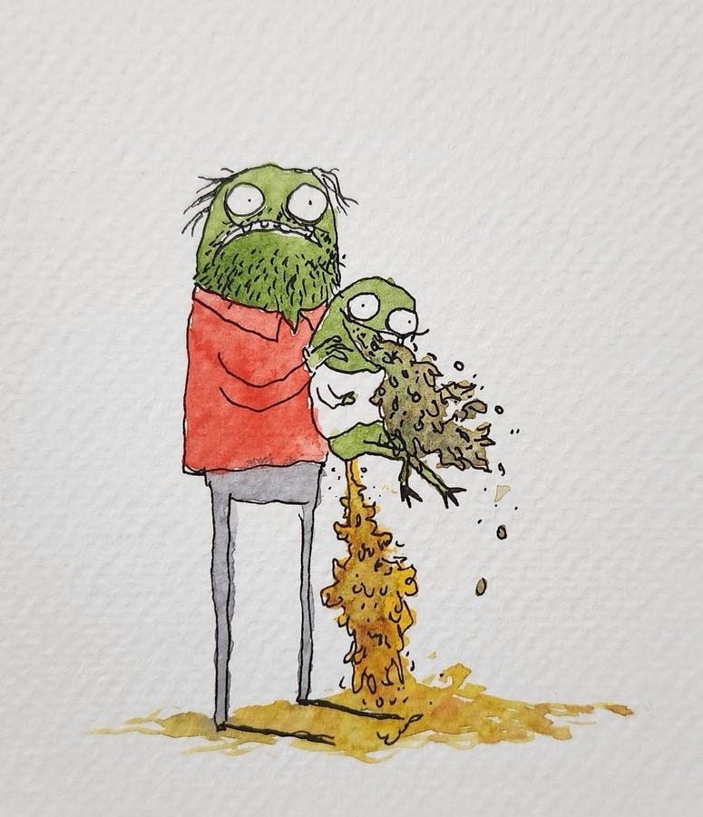 Whenever I’m feeling uninspired, creatively blocked, or just generally annoyed by the blank page, I open the Kyle folder. It is full of wobbly lines, strange creatures, and a frankly alarming amount of beautifully rendered bodily fluids.