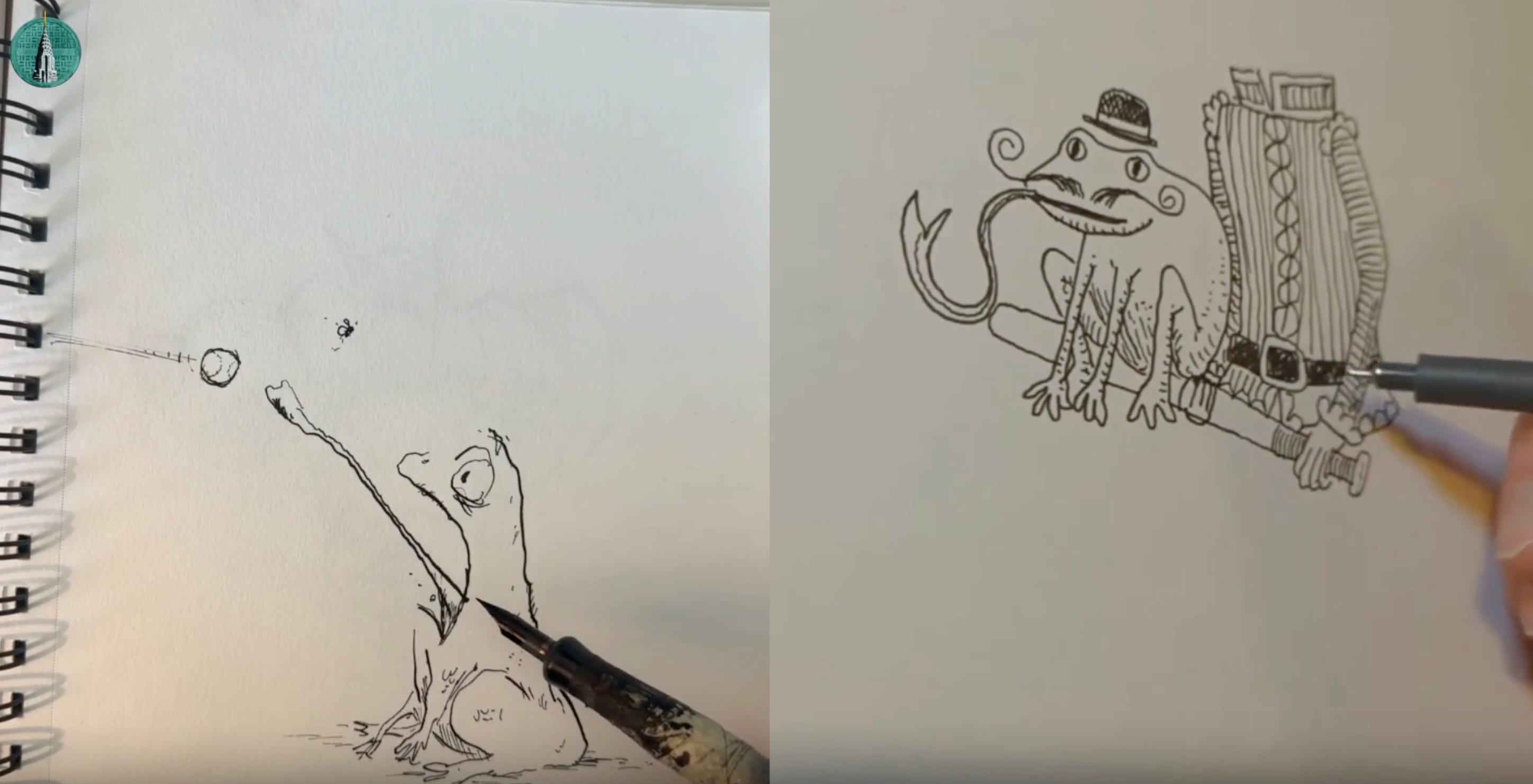 Meanwhile, the live chat was throwing out prompts. Paul Nesja suggested drawing the above-mentioned frog catching a fly ball. I sketched it out, immediately regretting my lack of reference material for amphibian anatomy. Drawing live while trying to conduct a coherent interview is basically an extreme sport, but it forces you to rely entirely on your muscle memory.