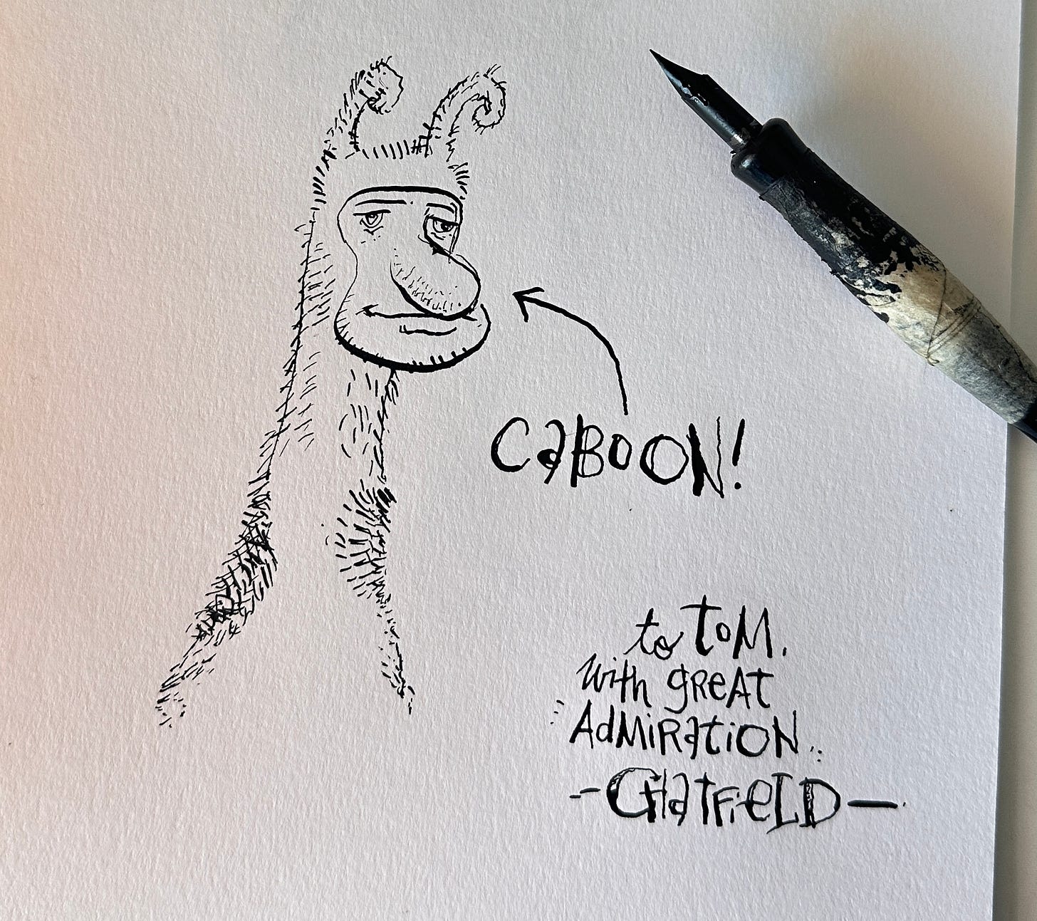 Halfway through the stream, we flipped the cameras and started scribbling. Tom uses a Staedtler 0.3 fineliner to achieve his incredibly detailed, controlled line work. After a suggestion from Hue Walker of a Frog on a Bat, he and I began drawing a Caboon, which is a feline-looking primate from his book that accompanies French Canadian taxi drivers to judge the character of potential passengers.