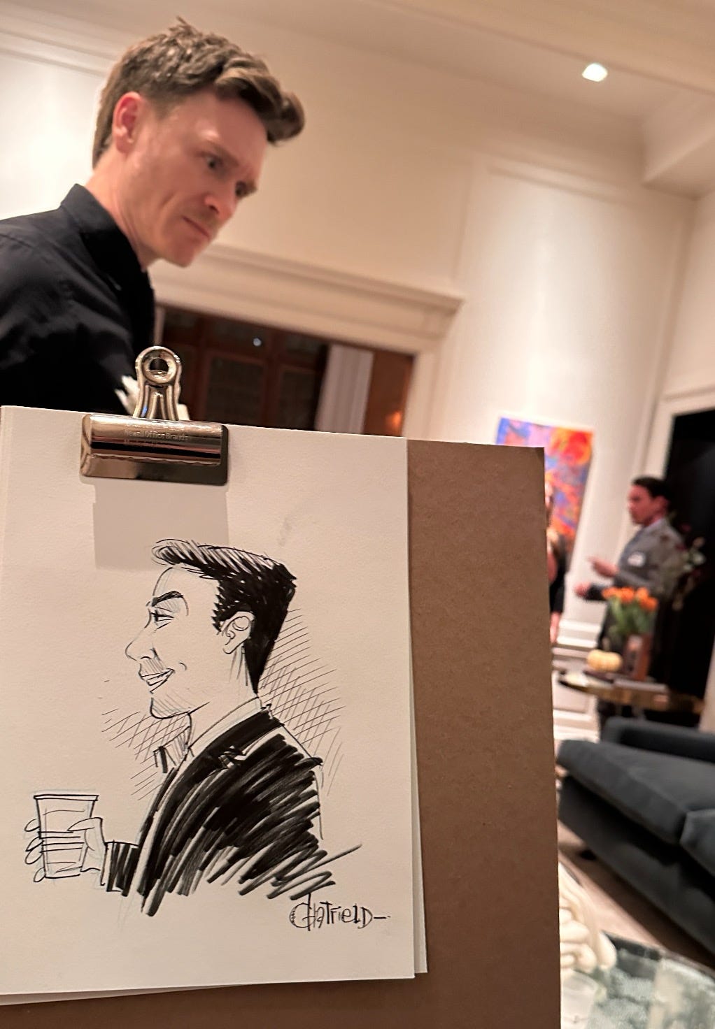 The house itself was something out of a Nancy Meyers fever dream: artfully decorated walls, impeccable lighting, and a bookshelf so symmetrical it made me sit up straighter. Drawing there felt less like live art and more like light vandalism.