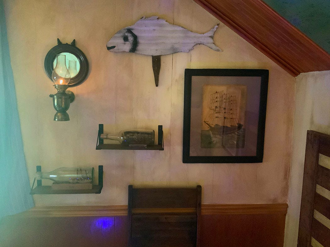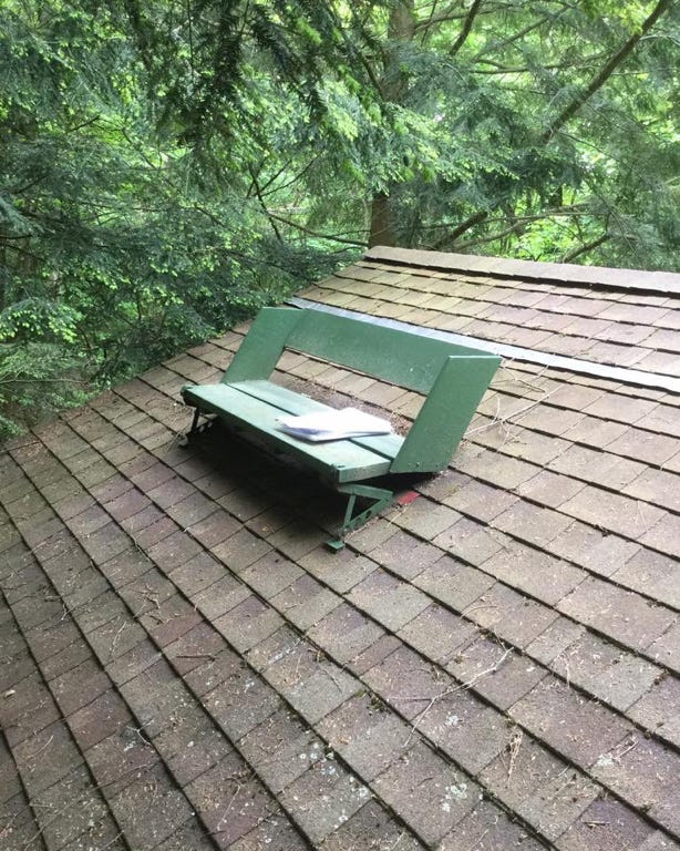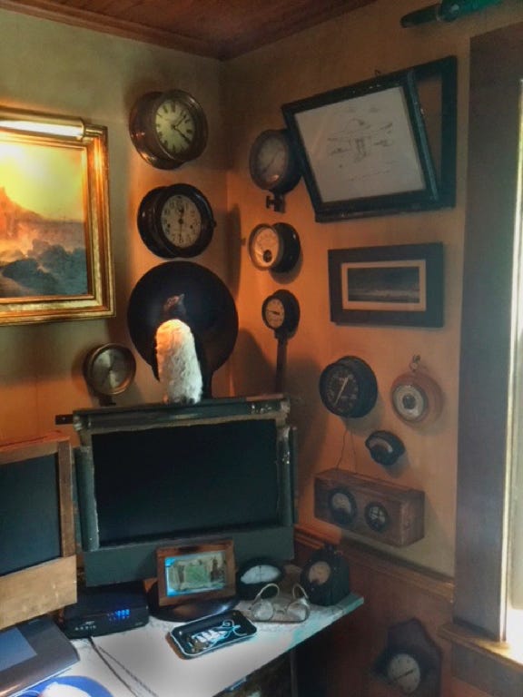 Bob showed us his studios. Plural. His outdoor office is literally a ten-dollar Adirondack bench he bolted to the roof so he can write in the breeze like a ship’s captain awaiting orders. His indoor studio looks like the set of Master and Commander, built by someone avoiding deadlines.