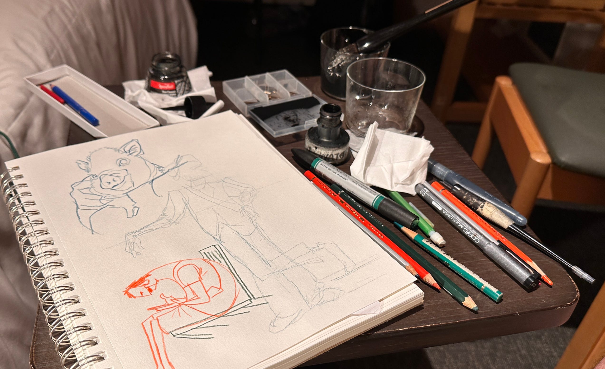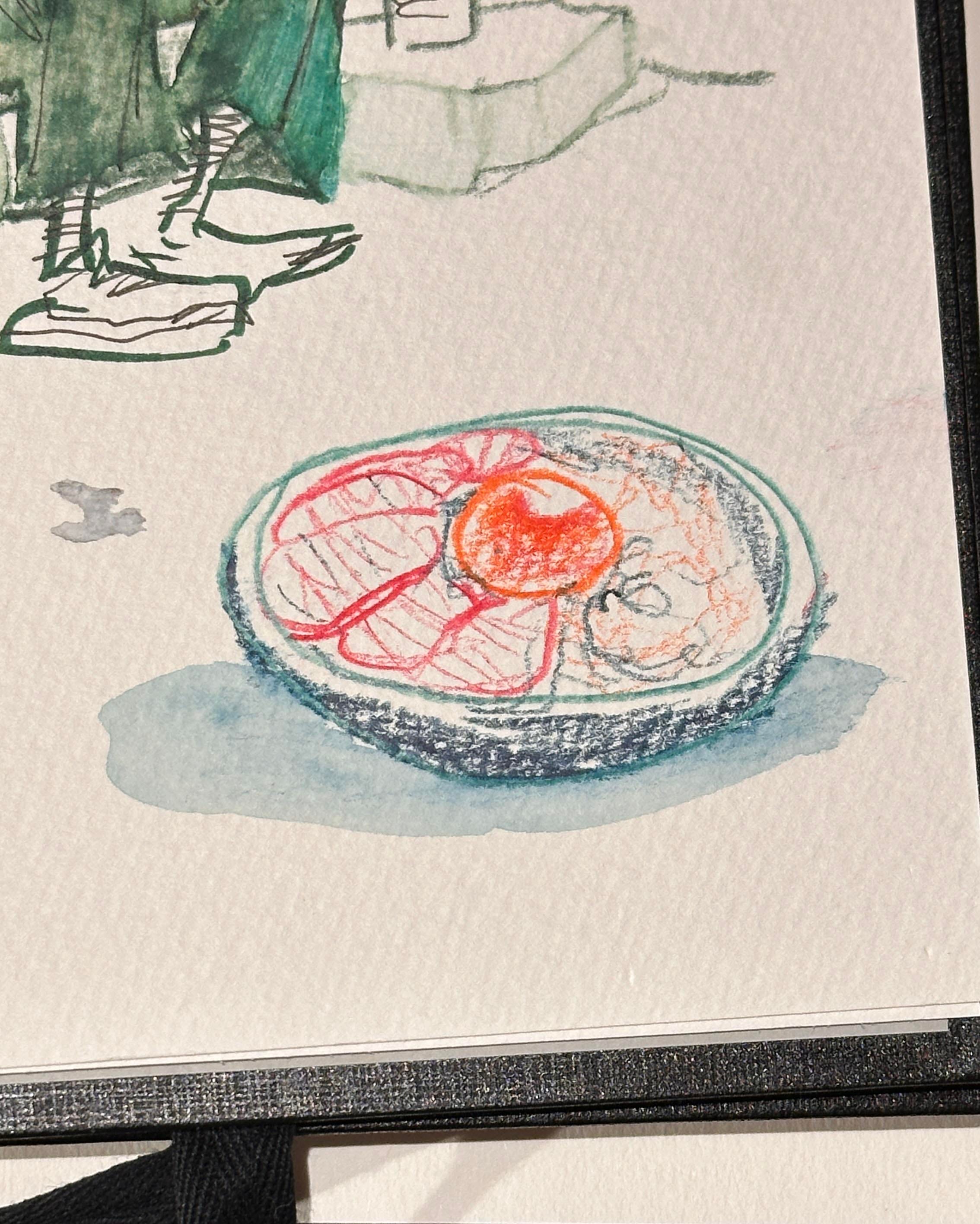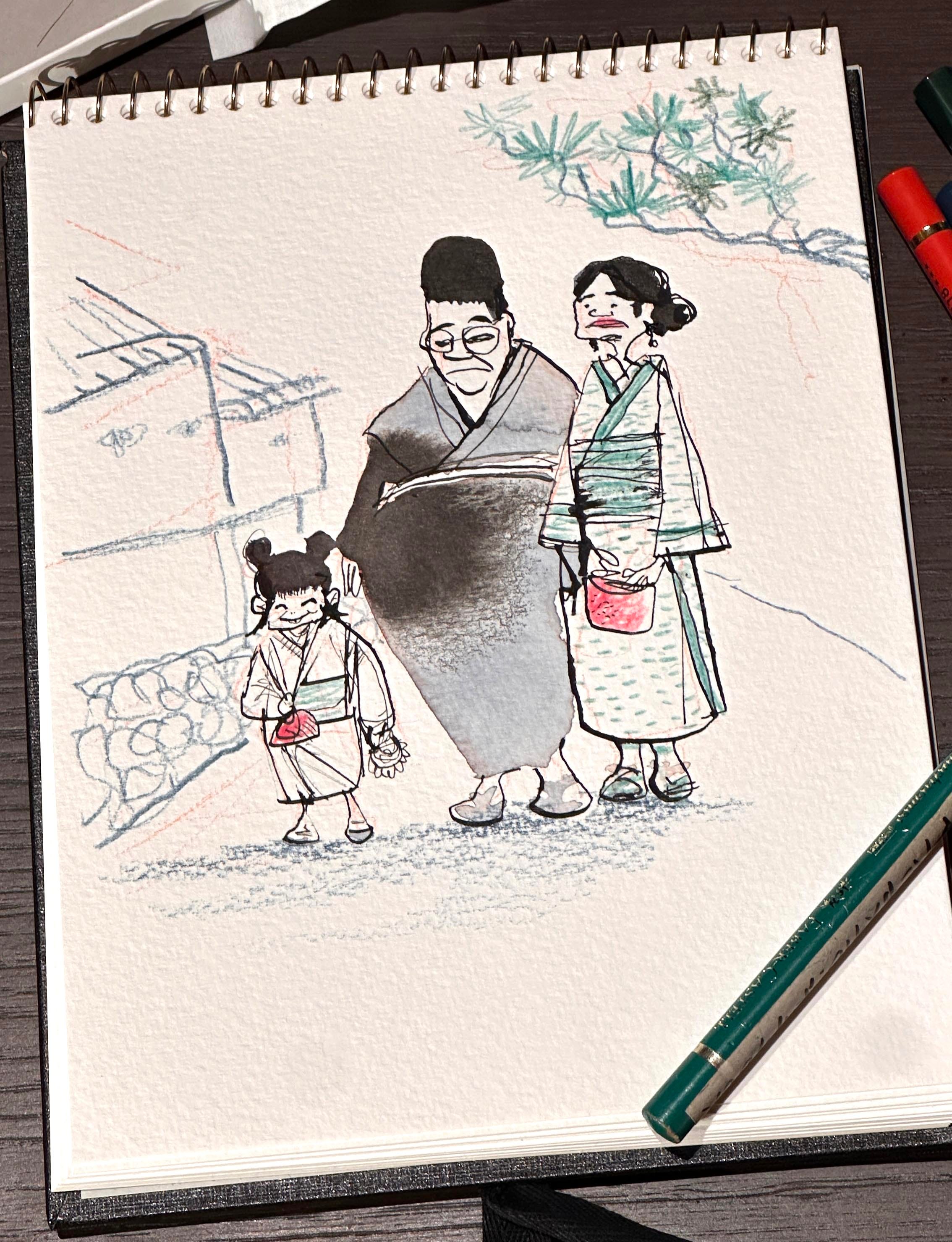 I settled in the hotel room at night for a sketch session, (with a little taste of Japanese Whiskey for inspiration.) — A young family dress in kimonos for a family portrait. An old man gets drunk alone on a secluded rock. A coffee shop that prohibits photos has the best-caffeinated beverages in Japan. A raw egg on my lunch is a hue I’ve never seen an egg take. I meet my newest friend at a visit to a micro-pig café. Enjoy.