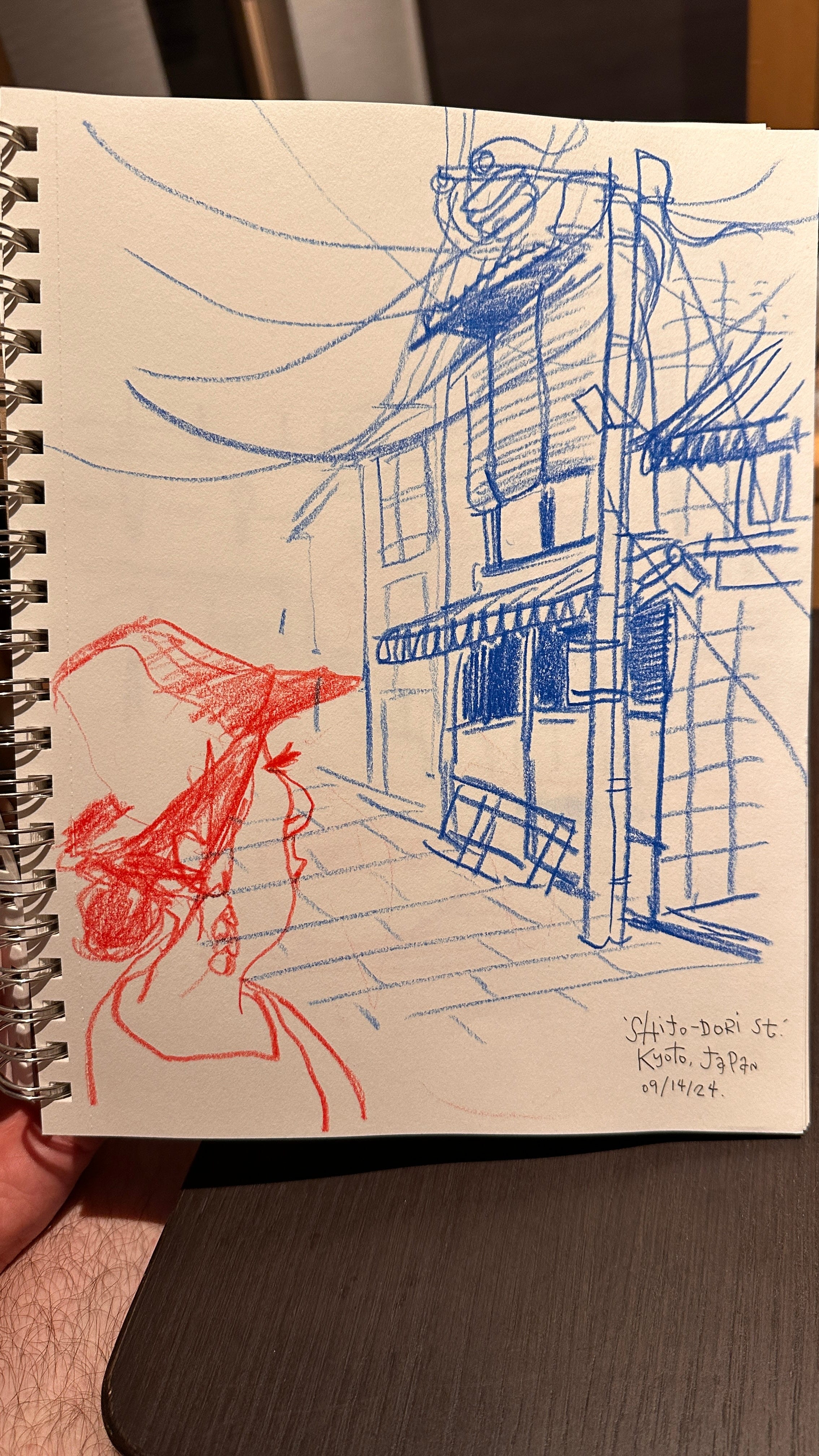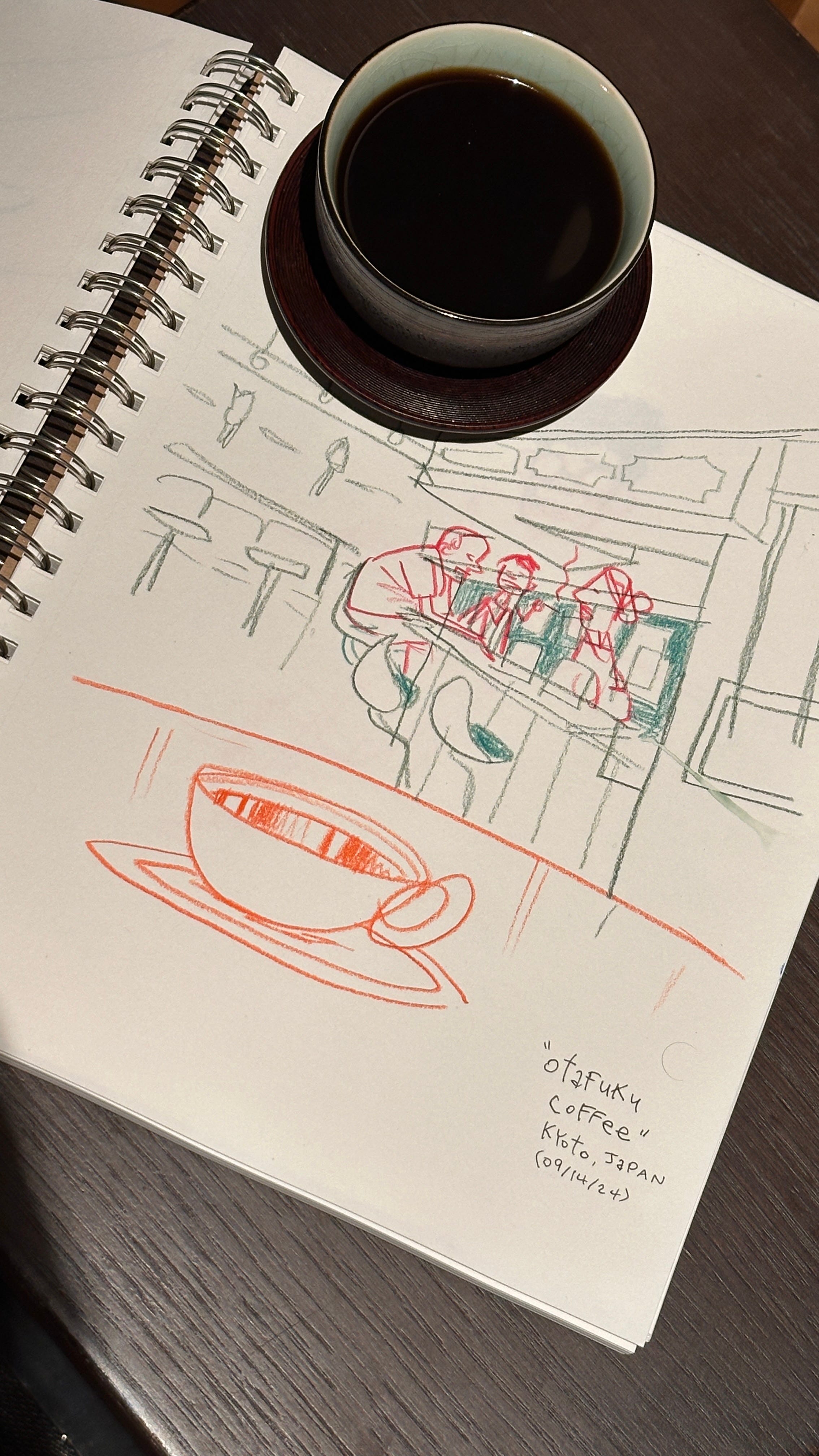 Ronny Chieng was texting me at random hours with recommendations of places to go while in Kyoto. He said there was this really nice little coffee place he found underground, but it prohibits photos. So, I took a mental picture and drew it. It was such a nice vibe.