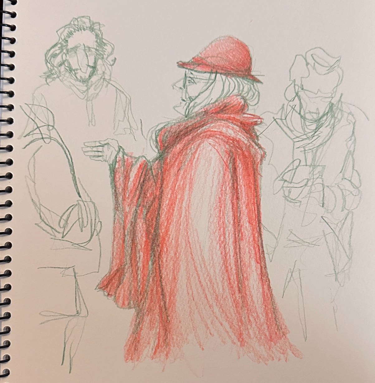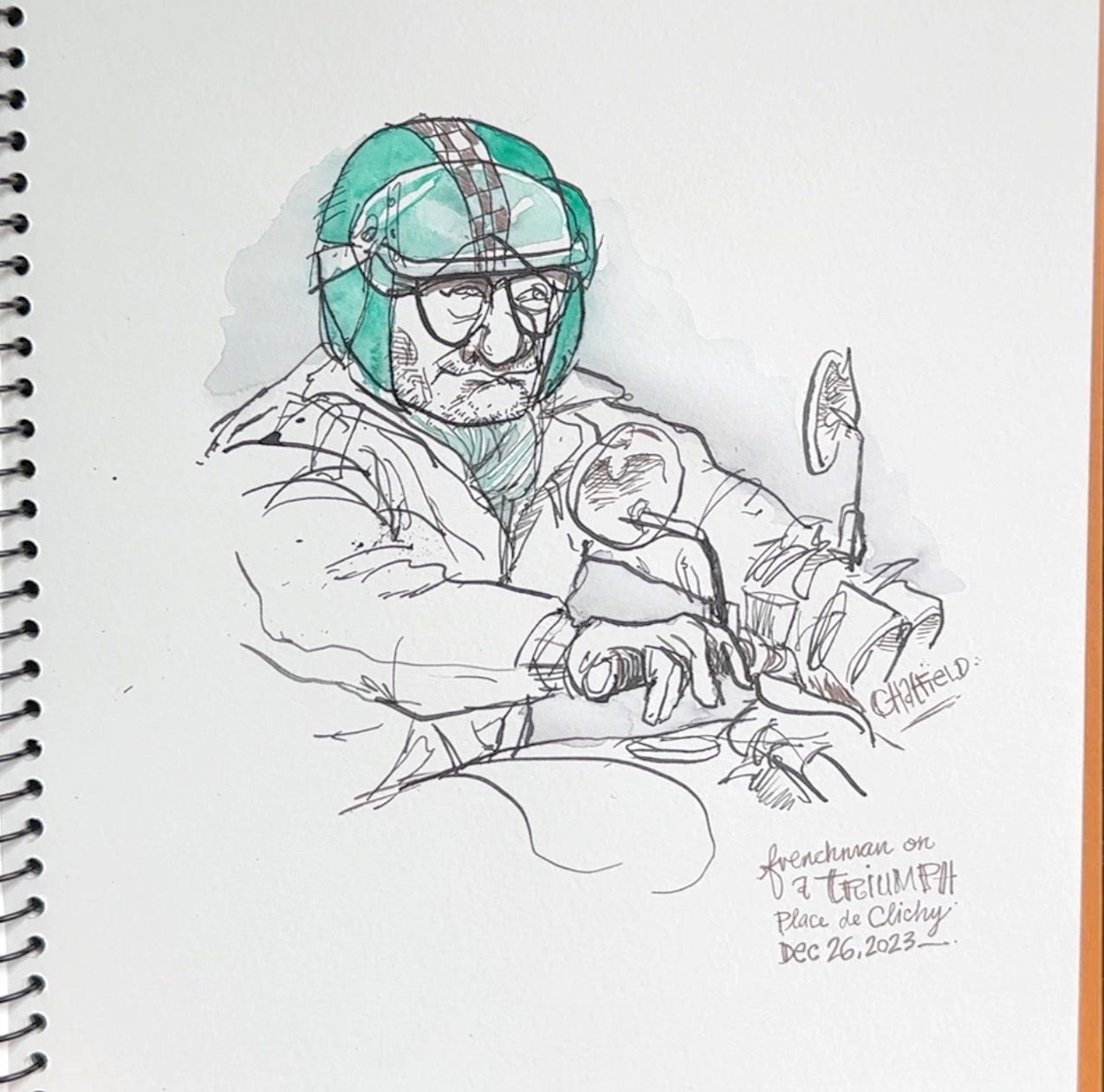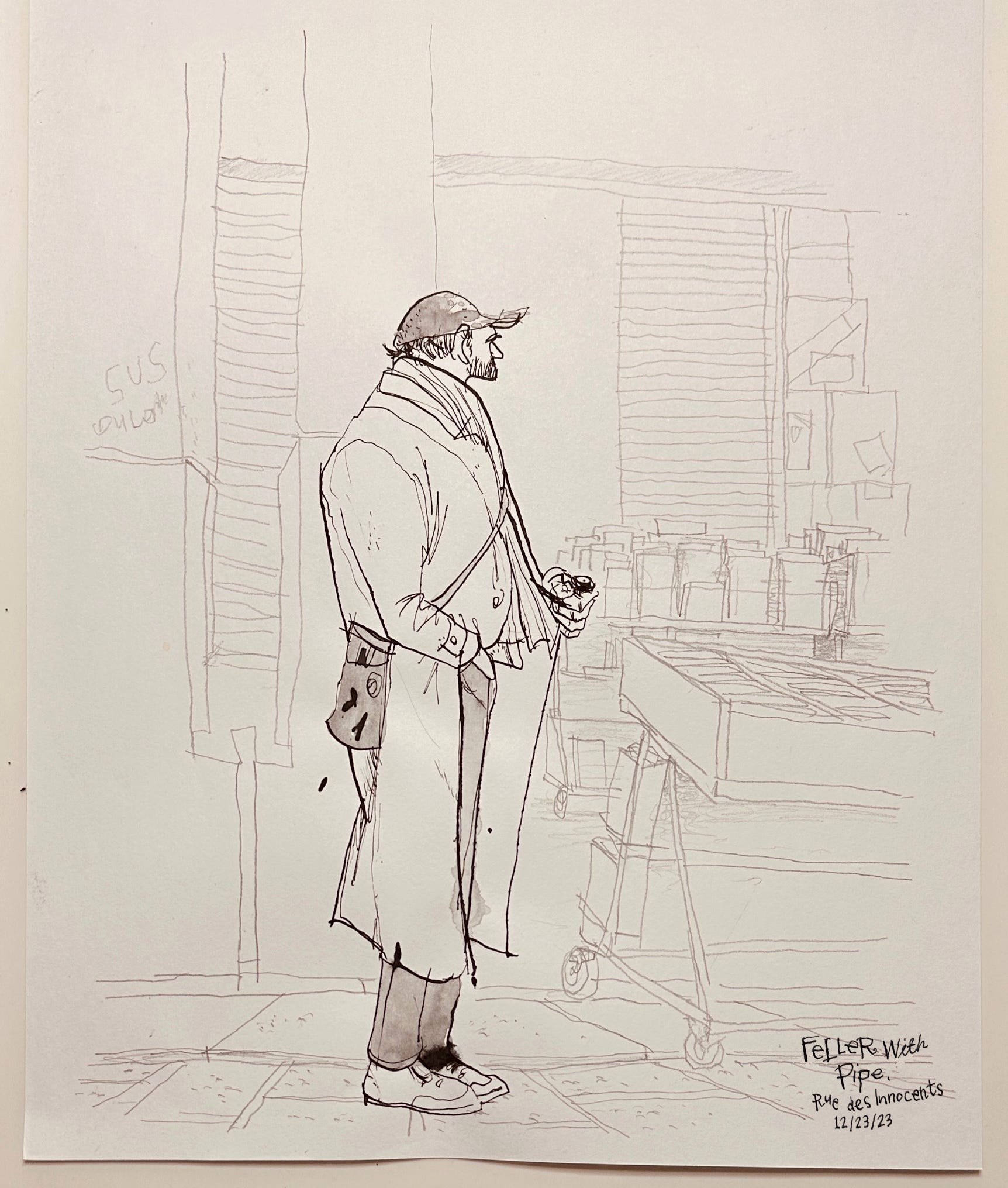 We saw an old man riding a Triumph, a guy with a pipe staring at a bookshop, motionless, and a woman in red trying to part her way through the sea of people in line at the movie theatre to go and see Aquaman 2. Seeing it in French did not make it any better. It is yet another truly terrible DC movie. But I digress… here are the sketches: