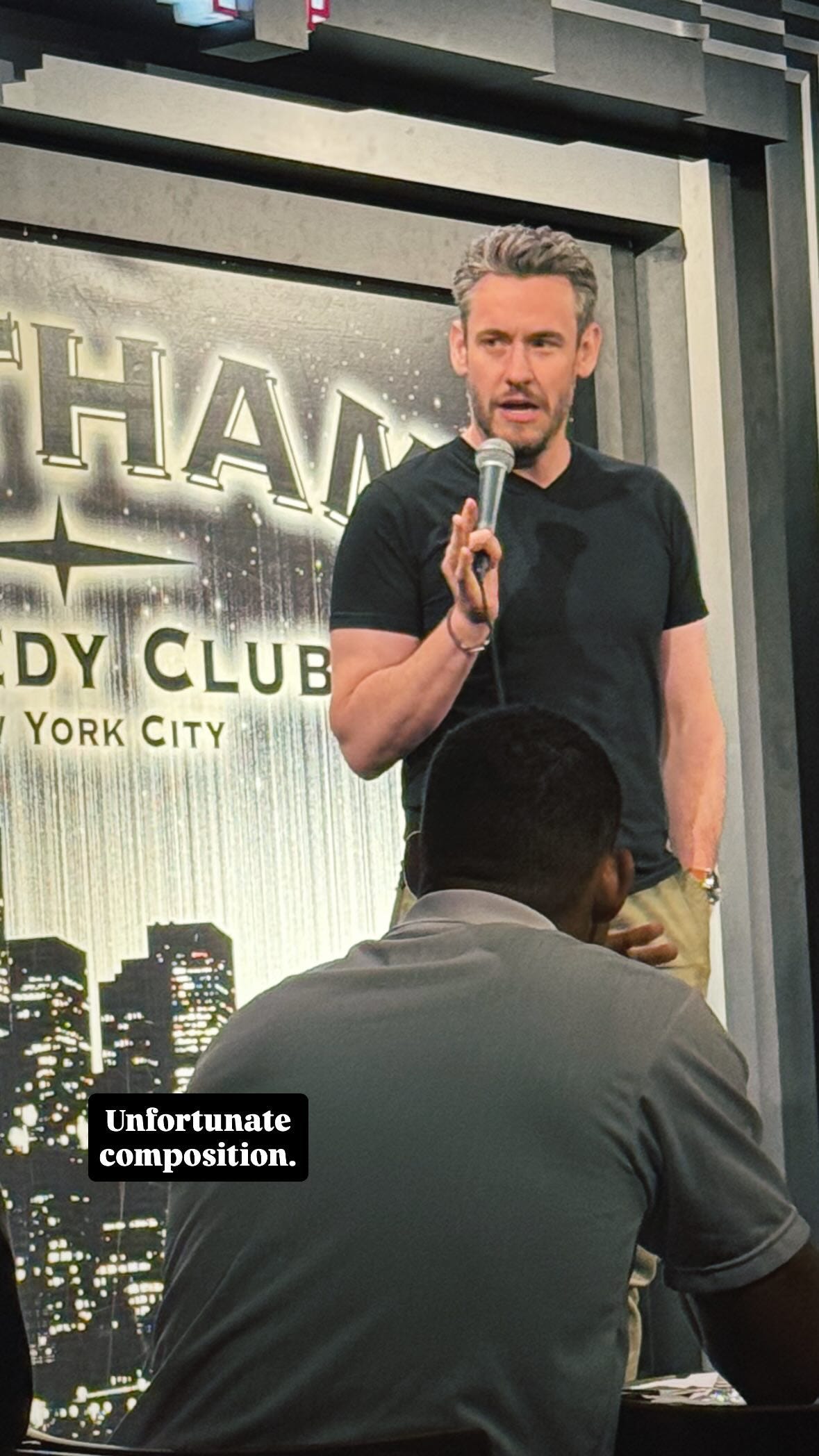 I did a guest spot at Gotham Comedy Club last week and had some friends in the audience. One of them took a photo of me on stage, which may well be the most unfortunate composition I’ve seen…