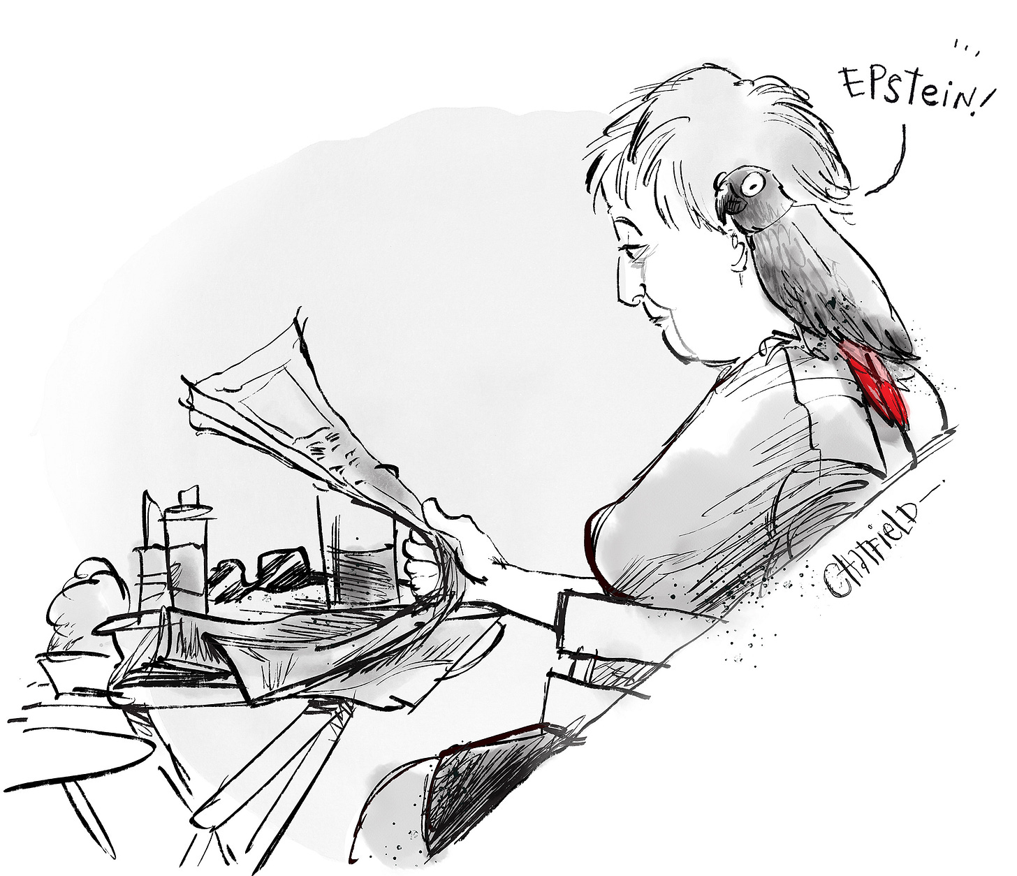 I was pedalling a broken Citibike down University Place this morning when I spotted her outside Madman Espresso: A woman sat casually reading the Times, coffee in hand, with a bird perched on her shoulder. The magnificent accessory—a Congo African Grey Parrot—was having what appeared to be a quiet breakfast conversation with her, occasionally dipping its beak towards her cup when she took a sip. I heard it squawk “Epstein!” a couple of times. They had the ease of an old couple who have been doing this morning routine for decades. I sneakily made a quick sketch before toppling over on the bike. The bell came off. Don’t tell anyone.