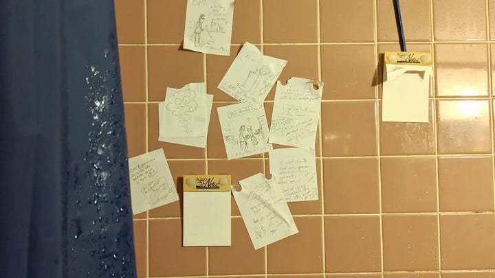 And because the universe has a cruel sense of humour, those ideas never happen when I am sitting obediently at my desk. “I literally keep waterproof pads in the shower,” I confessed... “Because that is where the real insights happen. It perfectly reflects the deeply unpredictable nature of creative thought.” (Anyone familiar with my ritual of ScotchBath Sunday won’t be surprised by this.)