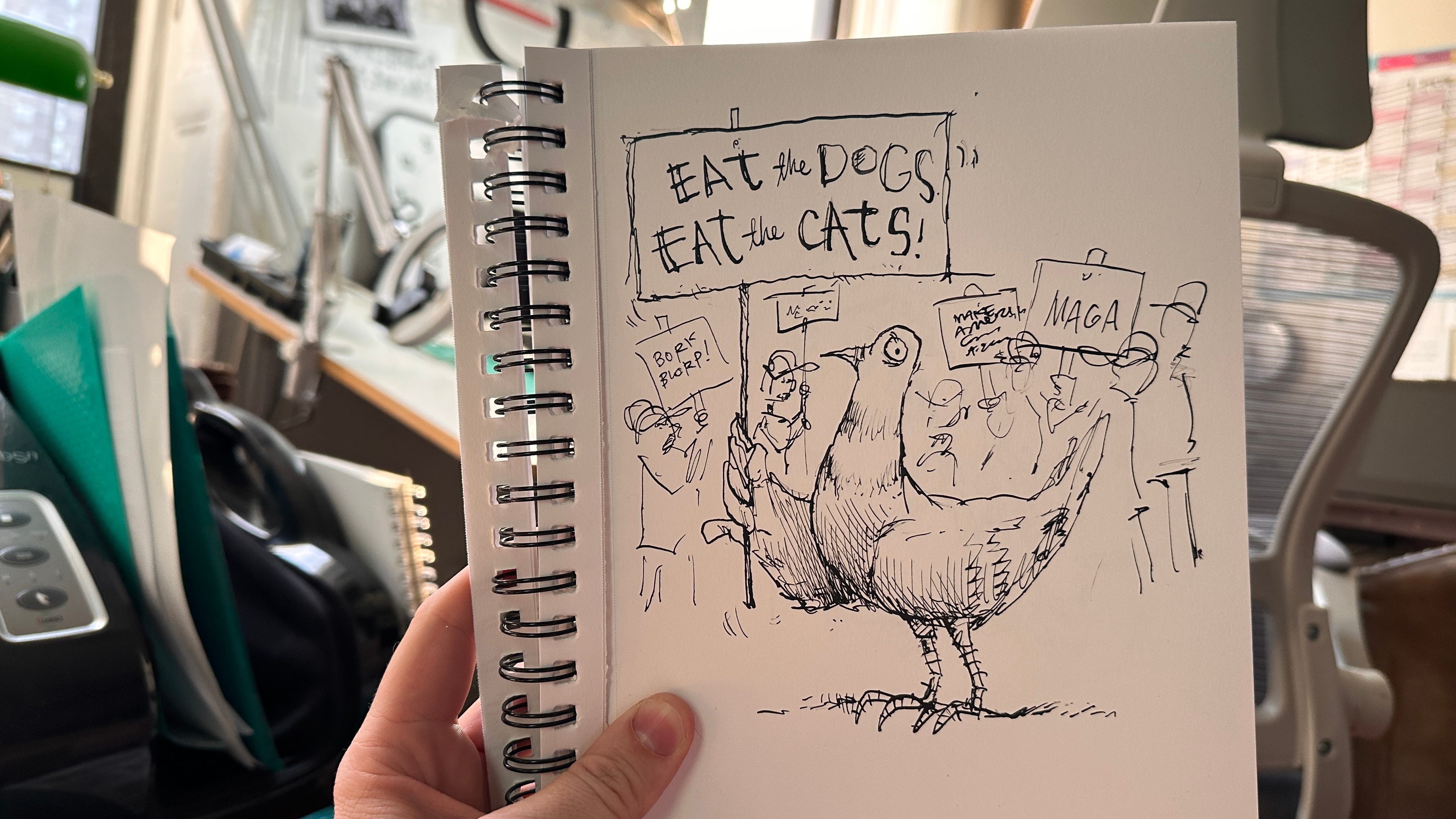 The second half of our chat featured both of us sketching while talking, with one drawing request of a "MAGA pigeon at an anti-Trump demonstration". We also talked about: