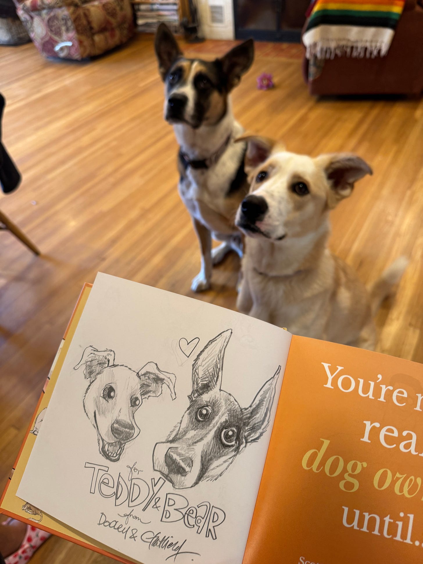 We’ll be signing books, doing custom dog sketches, and generally trying to contain our ‘speaking-to-dogs voices’ while drawing your beloved pets with great care and questionable accuracy.